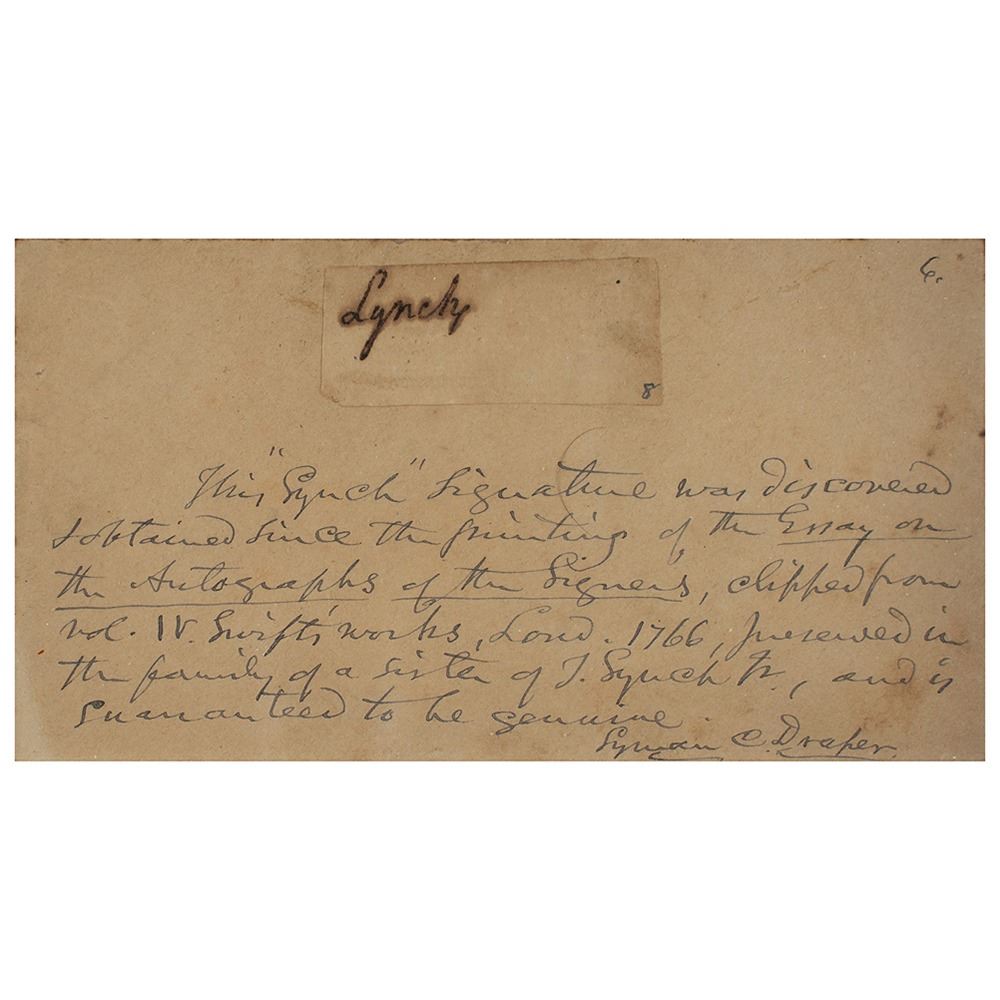 Exceedingly rare ink signature, "Lynch,†on an off-white 1.75 x .75 slip, expertly mounted to a display sheet with an affixed handwritten letter of provenance from noted collector and historian Lyman C. Draper, in full: "This 'Lynch' signature was discovered & obtained since the printing of the Essay on the Autographs of the Signers, clipped from Vol. IV Swift's Works, Lond. 1766, preserved in the family of a sister of T. Lynch, Jr. & is guaranteed to be genuine." Double-matted and framed with an engraved portrait (featuring a facsimile signature) to an overall size of 15.5 x 18.75. In fine condition.