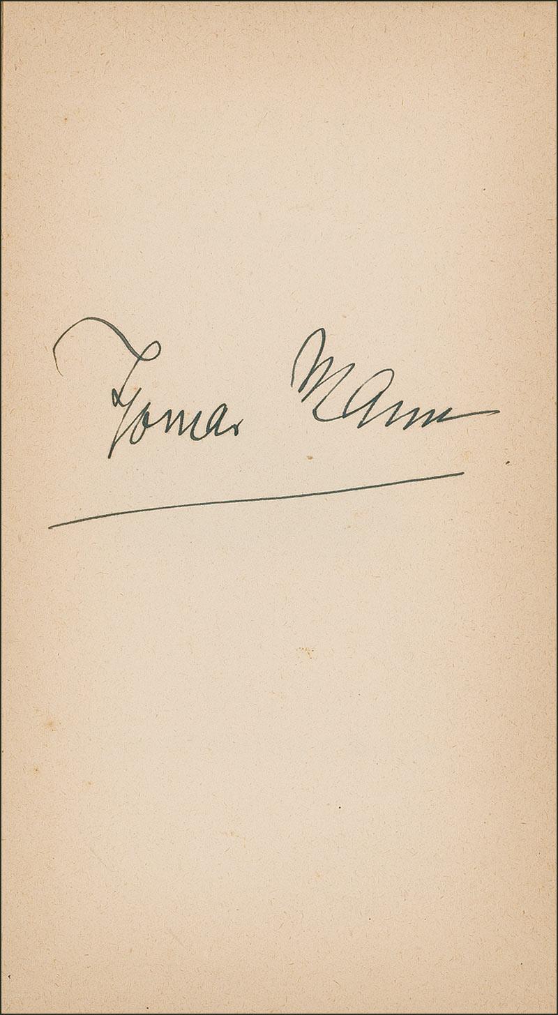 Signed book: Tonio Kroger. Berlin: S. Filcher Berlag, 1933. Hardcover, 4.5 x 7.5, 122 pages. Boldly signed in black ink on the second free end page. In fine condition, with edge toning to the signed page, the first free end page cut from the book, and mild toning to the spine.