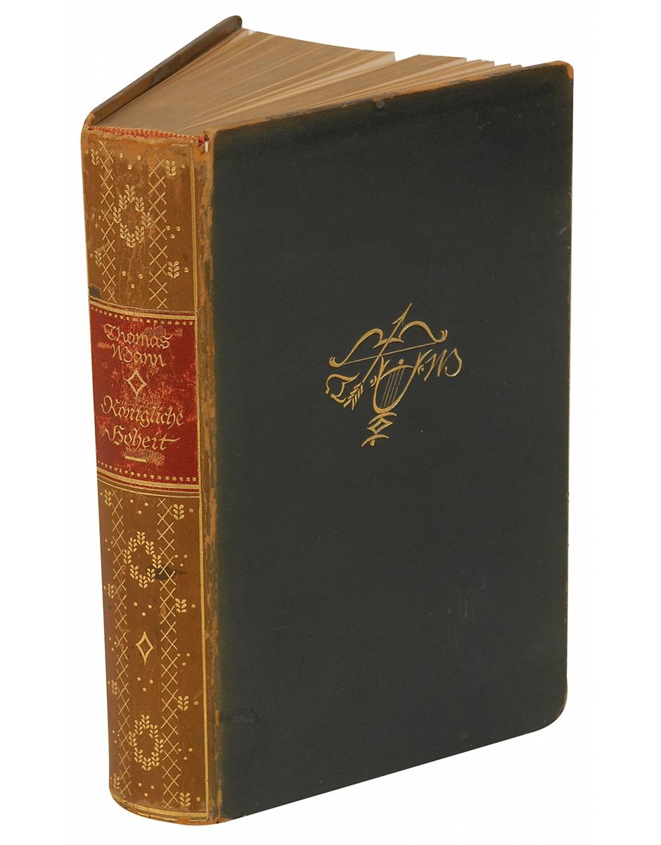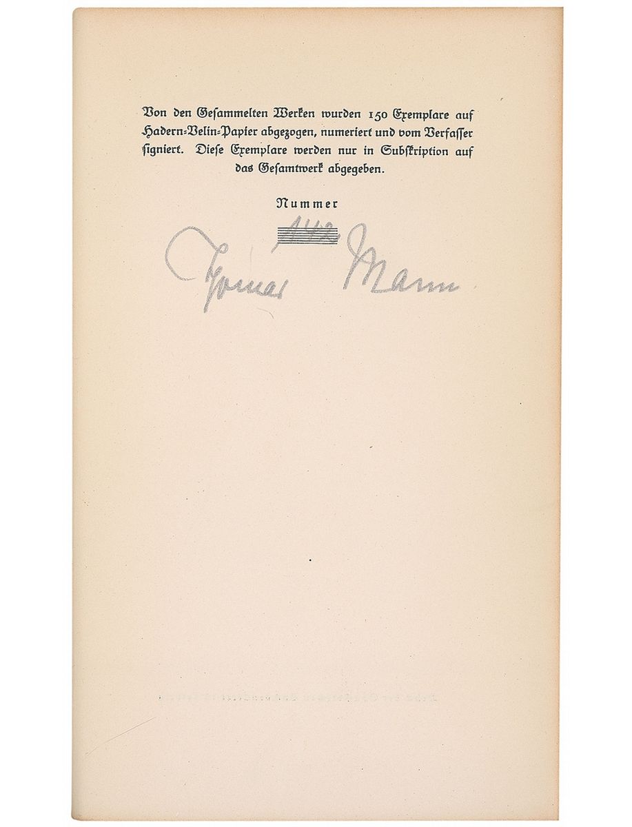 Highly influential, Nobel Prize–winning German novelist and social critic (1875–1955). Signed book: Konigliche Hoheit [Royal Highness]. Limited edition of 150 copies (this being No. 142). Berlin: S. Fischer, 1922. Hardcover, 4.75 x 7.5, 453 pages. Signed on the colophon in pencil. Autographic condition: fine. Book condition: VG/None. Navy paper-covered boards; gilted upper textblock edge. Bumps, tears, and rubbing along edges (mostly at corners and spine-ends); spine sunned; textblock edges very slightly yellowed. Binding tight and interior crisp and clean.