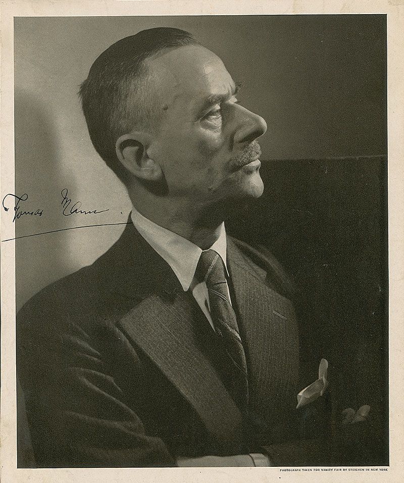 Vintage 8 x 9.5 magazine photo of Mann taken for Vanity Fair by Edward Steichen, signed in fountain pen. In fine condition, with nice contrast to the signature against the light background. Accompanied by a frame. Mann photos this large are quite scarce.