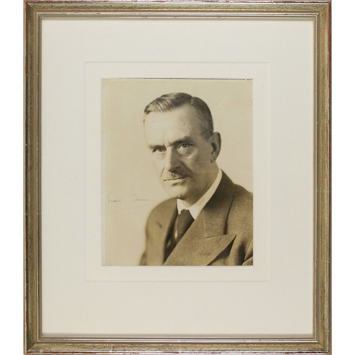 Highly influential, Nobel Prize–winning German novelist and social critic (1875–1955). Vintage matte-finish 7.5 x 9.25 photo, signed in ink. Double-matted and framed to an overall size of 15.5 x 17.75. In very good condition, with slightly irregular adhesion to signature (still fully legible), scattered soiling, and rippling and small creases to edges.