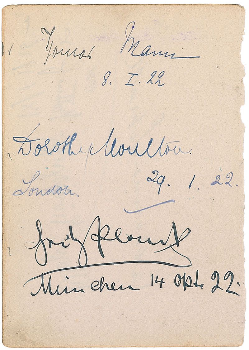 Highly influential, Nobel Prize–winning German novelist and social critic (1875–1955). Ink signature, “Thomas Mann, 8.I.22,” on an off-white 4.75 x 7 album page, page is also signed by two others, and also signed on the reverse by Katharina Schratt (actress and mistress of Emporer Franz Josef I) and Olga von Konigsegg-Rothenfels. In fine condition, with a bit of scattered light toning and soiling.