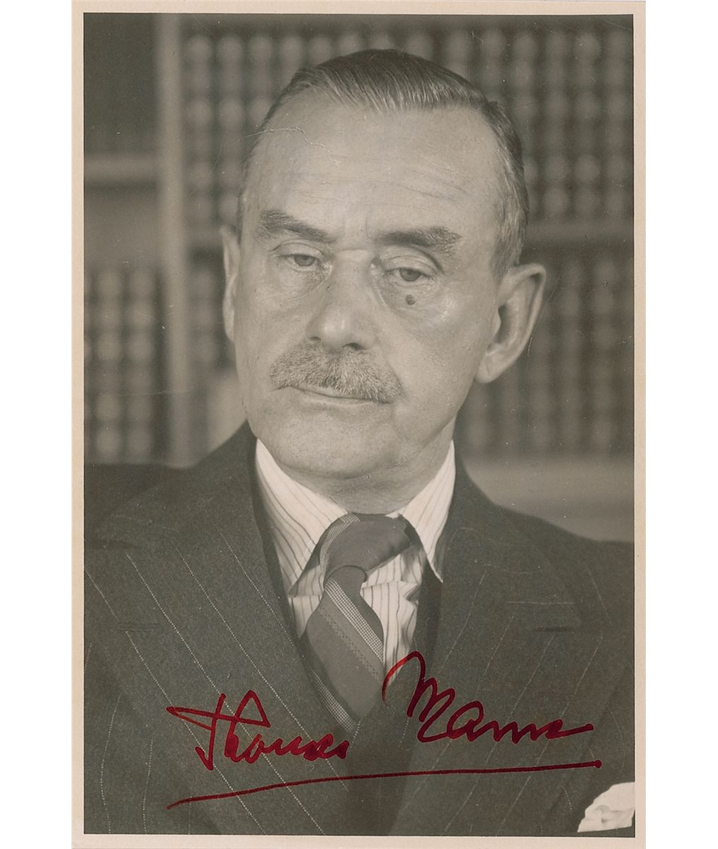 Uncommon matte-finish 3.25 x 5 bust portrait of Mann in a suit and tie, signed at the bottom in red ink. Surface creases and a paper clip impression to left edge, otherwise fine condition. Accompanied by the original mailing envelope.