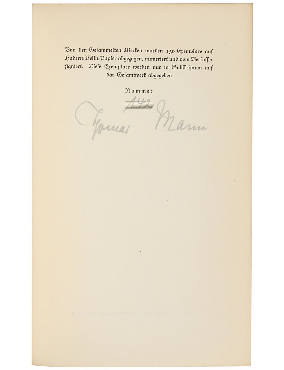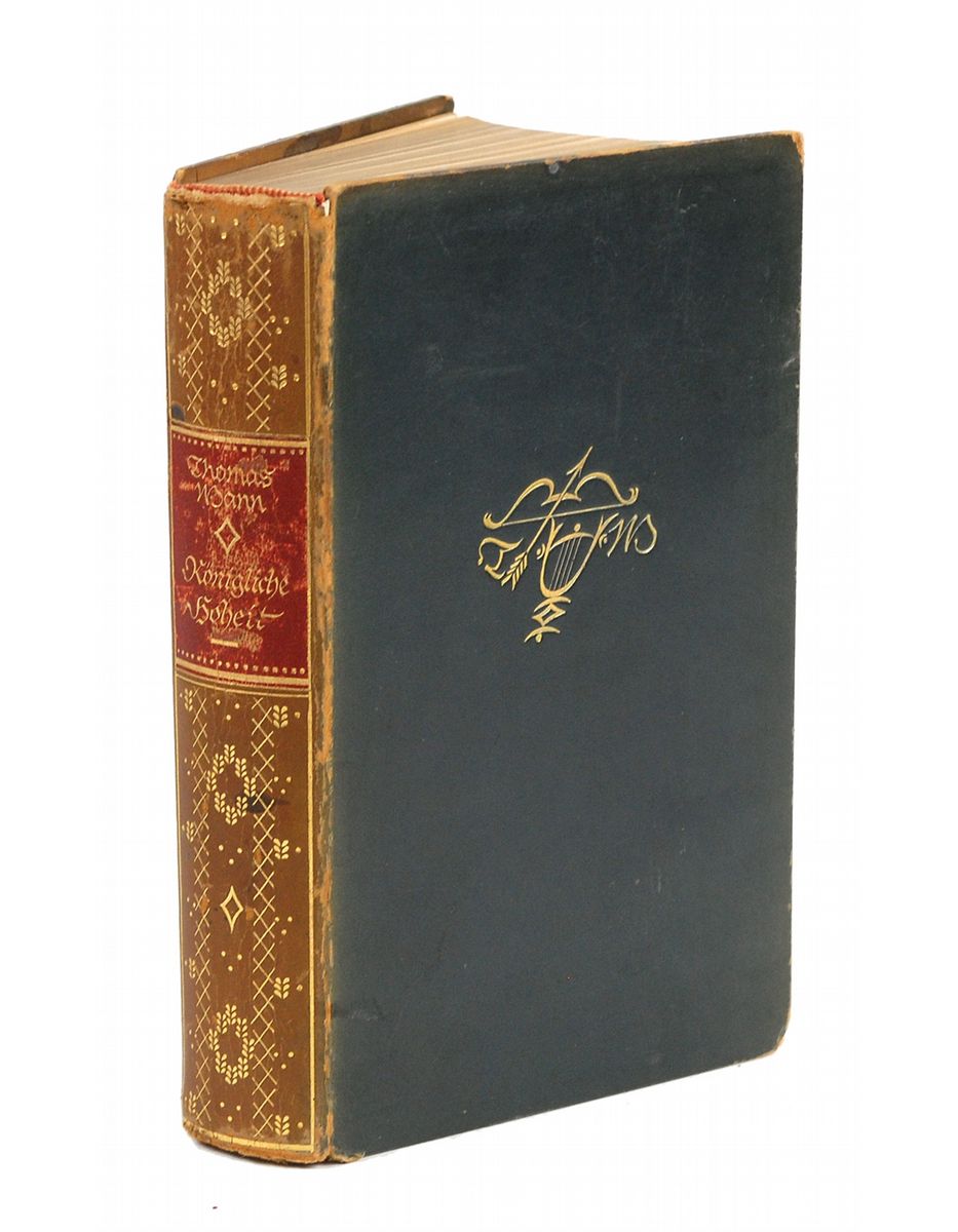 Highly influential, Nobel Prize–winning German novelist and social critic (1875–1955). Signed book: Konigliche Hoheit [Royal Highness]. Limited edition of 150 copies (this being No. 142). Berlin: S. Fischer, 1922. Hardcover, 4.75 x 7.5, 453 pages. Signed on the colophon in pencil. Autographic condition: fine. Book condition: VG/None.