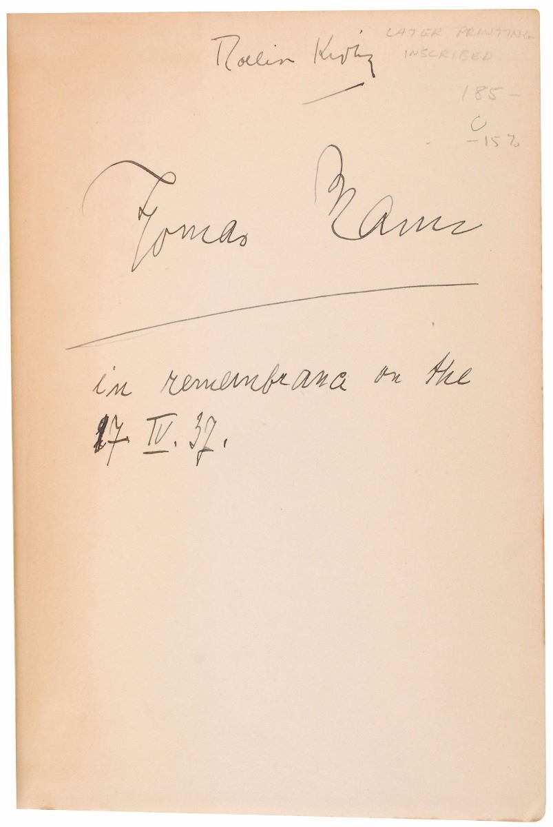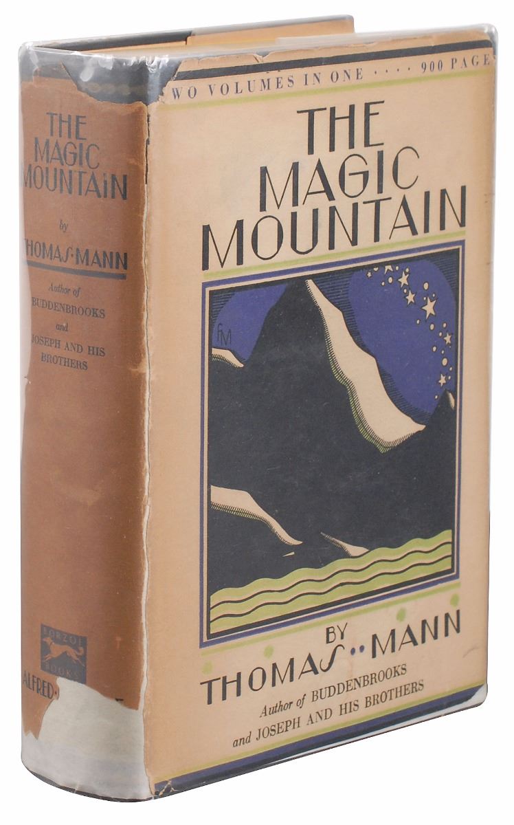 Signed book: The Magic Mountain. Later printing. NY: Alfred A. Knopf, 1934. Hardcover with dust jacket, 5.5 x 7.75, 900 pages. Signed and inscribed on the first free end page in fountain pen, and dated April 17, 1937. In very good condition, with toning to signed page, chipping to dust jacket (especially to the spine), and some light staining and soiling.