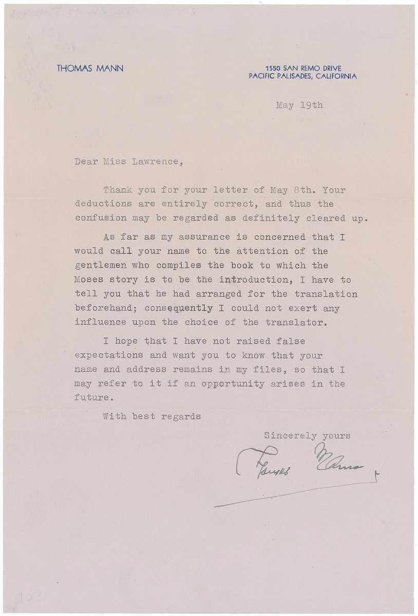 TLS, one page, 7.25 x 10.75, personal letterhead, May 19 [1943]. Letter to Miss Lawrence, in full: “Thank you for your letter of May 8th. Your deductions are entirely correct, and thus the confusion may be regarded as definitely cleared up. As far as my assurance is concerned that I would call your name to the attention of the gentlemen who compiles the book to which the Moses story is to be the introduction, I have to tell you that he had arranged for the translation beforehand; consequently I could not exert any influence upon the choice of the translator. I hope that I have not raised false expectations and want you to know that your name and address remains in my files, so that I may refer to it if an opportunity arises in the future.” In fine condition, with a pair of pin holes to bottom edge. The story mentioned is ‘Das Gesetz,’ a work about Moses that Mann wrote in the early portions of 1943, and which was later used as the opening piece in the collection The Ten Commandments: Ten Short Novels of Hitler’s War Against the Moral Code.