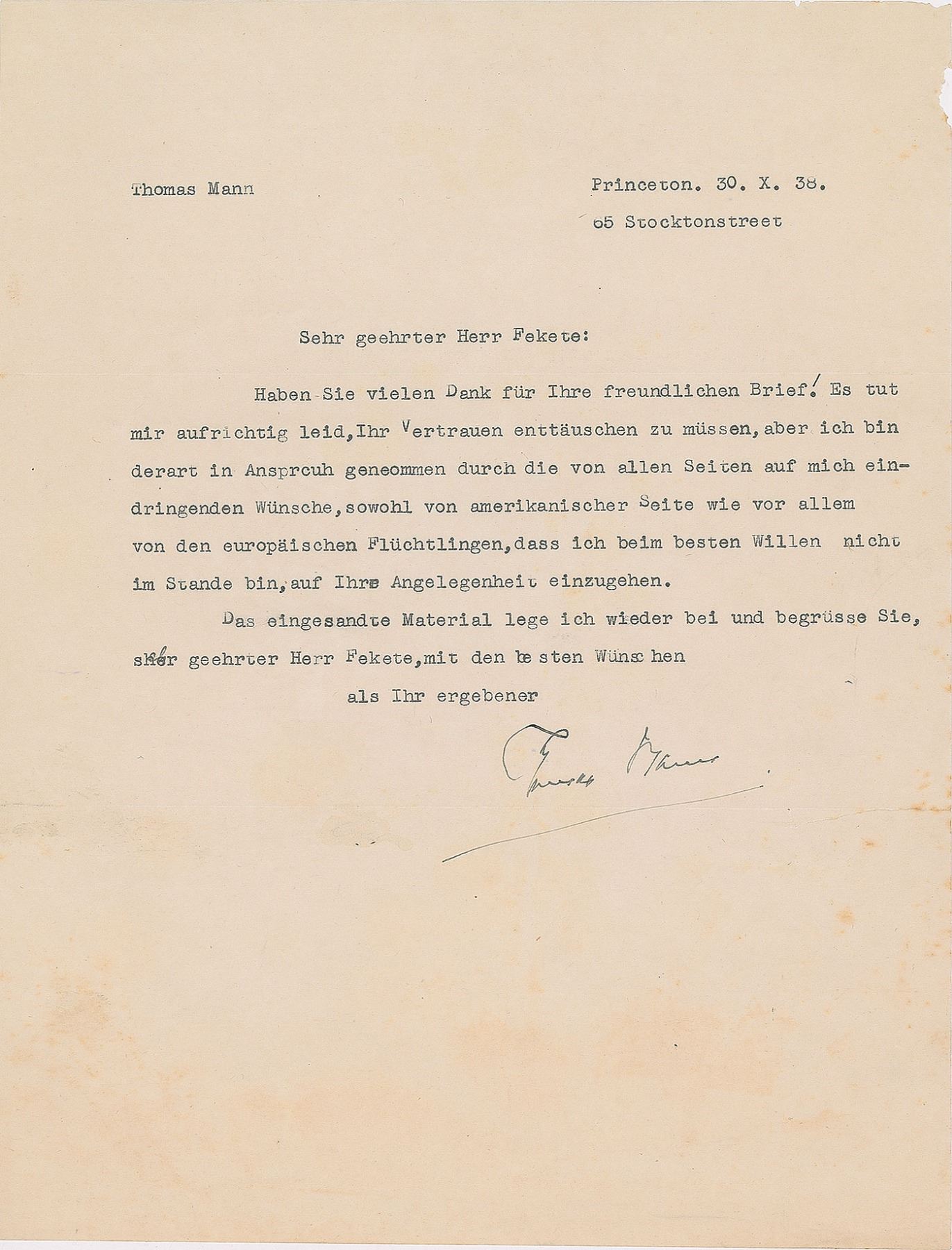 TLS in German, one page, 8.5 x 11, October 30, 1938. Letter to the Hungarian-born conductor Zoltan Fekete, in part (loosely translated): "Thank you for your kind letter! I am truly sorry to have to exchange your confidence, but I am so reproached by the desires that come to me from all sides, both from the American side and above all from the European side, that with the best will I am unable to deal with your business. I enclose the material sent." In fine condition, with some minor paper loss to the upper right.