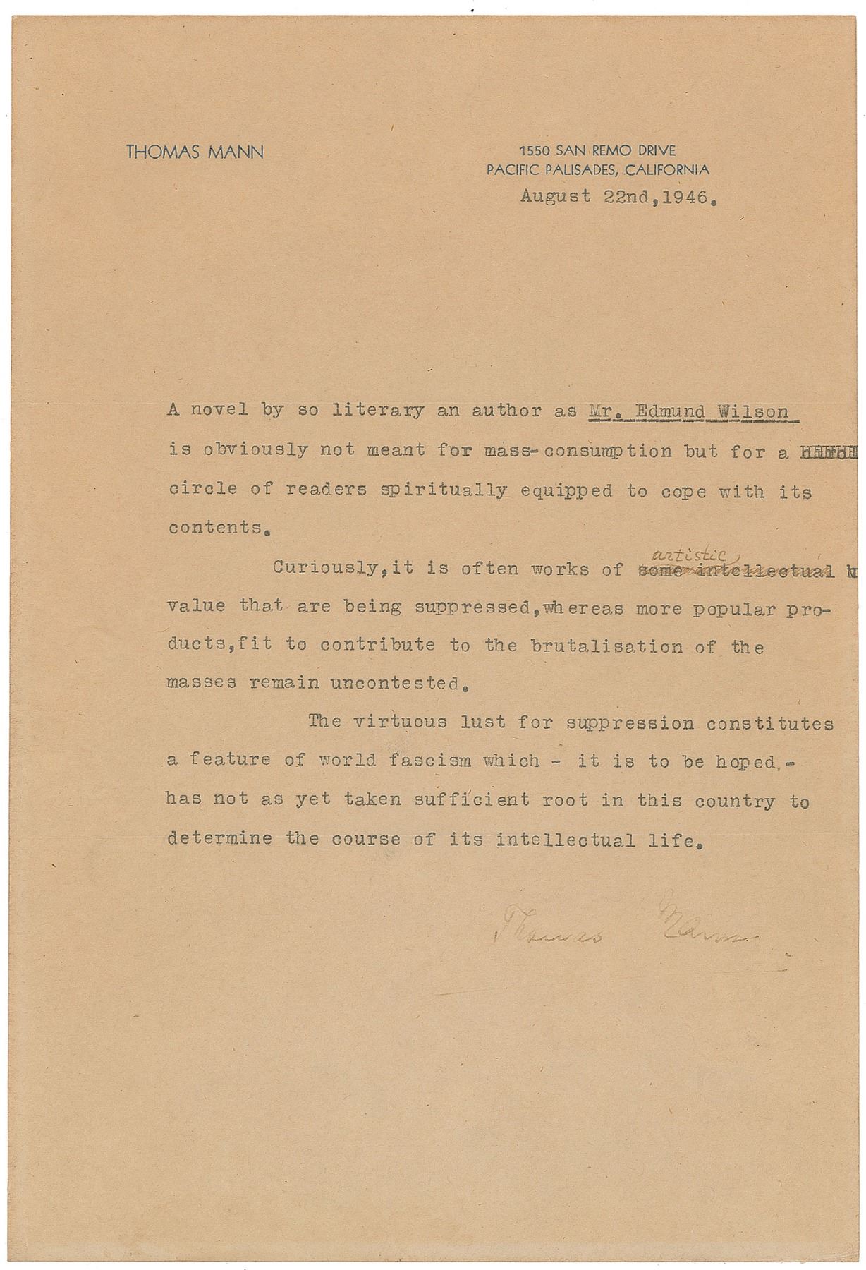 Typed manuscript, one page, 7.25 x 10.5, personal letterhead, August 22, 1946, in full: "A novel by so literary an author as Mr. Edmund Wilson is obviously not meant for mass-consumption but for a circle of readers spiritually equipped to cope with its contents. Curiously, it is often works of artistic value that are being suppressed, whereas more popular products, fit to contribute to the brutalisation of the masses remain uncontested. The virtuous lust for suppression constitutes a feature of world fascism which—it is to be hoped—has not yet taken sufficient root in this country to determine the course of its intellectual life." Signed at the conclusion in ink by Mann, who corrects a single word of the text. In fine condition, with the signature very faded but fully legible. Mann won the Nobel Prize for Literature in 1924 after publishing The Magic Mountain. He was one of many German writers and intellectuals who left Germany when Hitler came to power, fleeing to Switzerland in 1933, and when the war began in 1939, moving to the United States. He lived there until 1952, when he returned to Switzerland. American writer and literary critic Edmund Wilson's Memoirs of Hecate County was first published in 1946, but was banned in the United States until 1959.