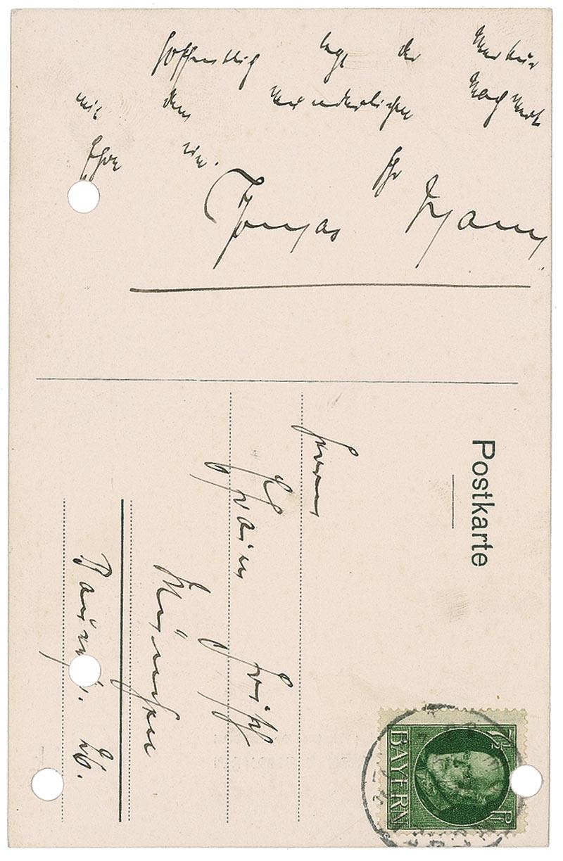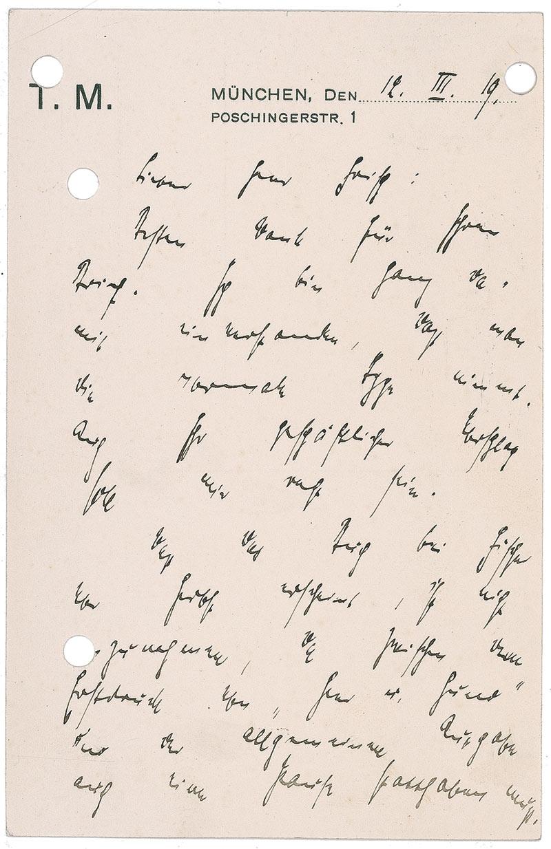 Highly influential, Nobel Prize–winning German novelist and social critic (1875–1955) who penned such classics as Death in Venice and The Magic Mountain. ALS in German, both sides of a 3.5 x 5.5 personal notecard, March 12, 1919. Letter to Efraim Frisch, the publisher of the Neuen Merku in Munich. In part [translated]: “I totally agree that it takes the normal type. Even your business proposal to me to be right. That the book by Fischer appeared before the fall, is not to grow [in], because between the first edition of Mr. and dog 'and the general issue must take place a break. Hopefully, the Mercury sets with the curious concoction honor.” In fine condition, with four punch holes and a bit of scattered light soiling. The literary and political journal Der neue Merkur appeared in Germany between 1914 and 1925. Pre-certified PSA/DNA and RRAuction COA.