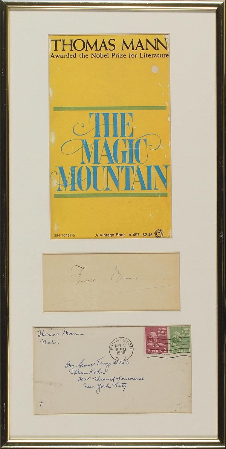 Fountain pen signature, “Thomas Mann,” on an off-white 4.5 x 2 slip. Matted with a paperback cover of The Magic Mountain and a mailing envelope addressed in another hand, postmarked November 2, 1938, and framed to an overall size of 7.75 x 15.25. In very good condition, with light horizontal bend, uniform toning, and an area of discoloration touching his first name.