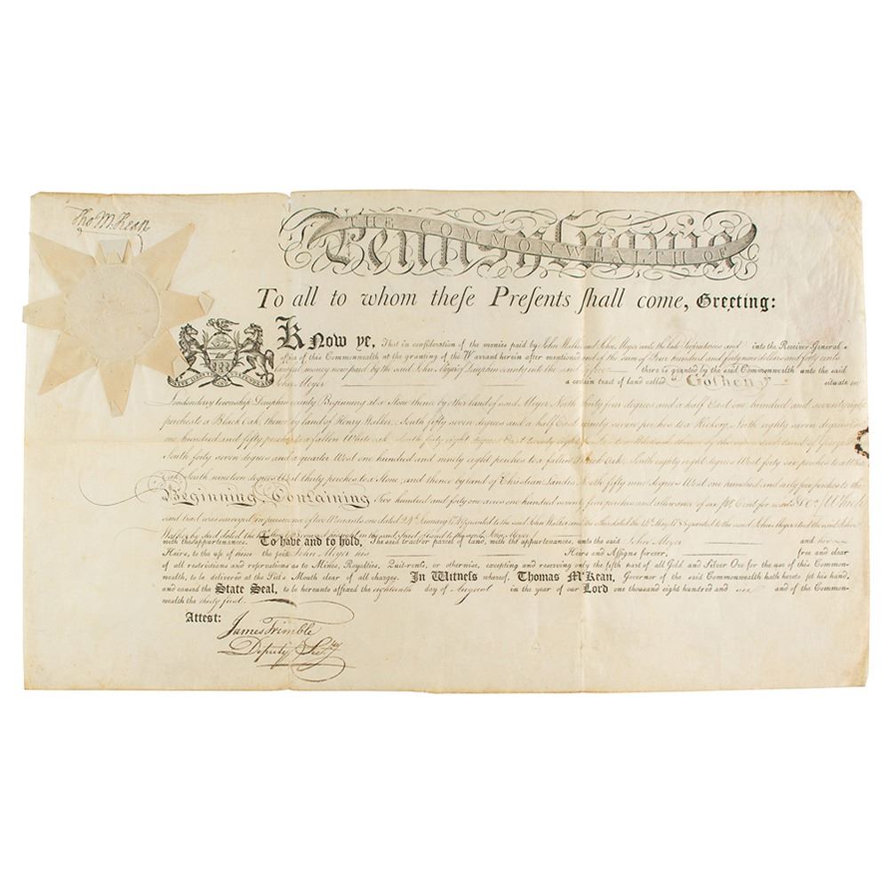 Partly-printed vellum DS, signed “Tho's M:Kean,†one page, 20.25 x 12, August 18, 1806. As governor of Pennsylvania, McKean grants John Walker and John Meyer a "certain tract of land called 'Goshen,' situate in Londonderry township, Dauphin county." Signed in the upper left by Governor McKean and countersigned at the conclusion by James Trimble as deputy secretary. The seal affixed to the upper left remains intact. In fine condition, with a few tiny holes.