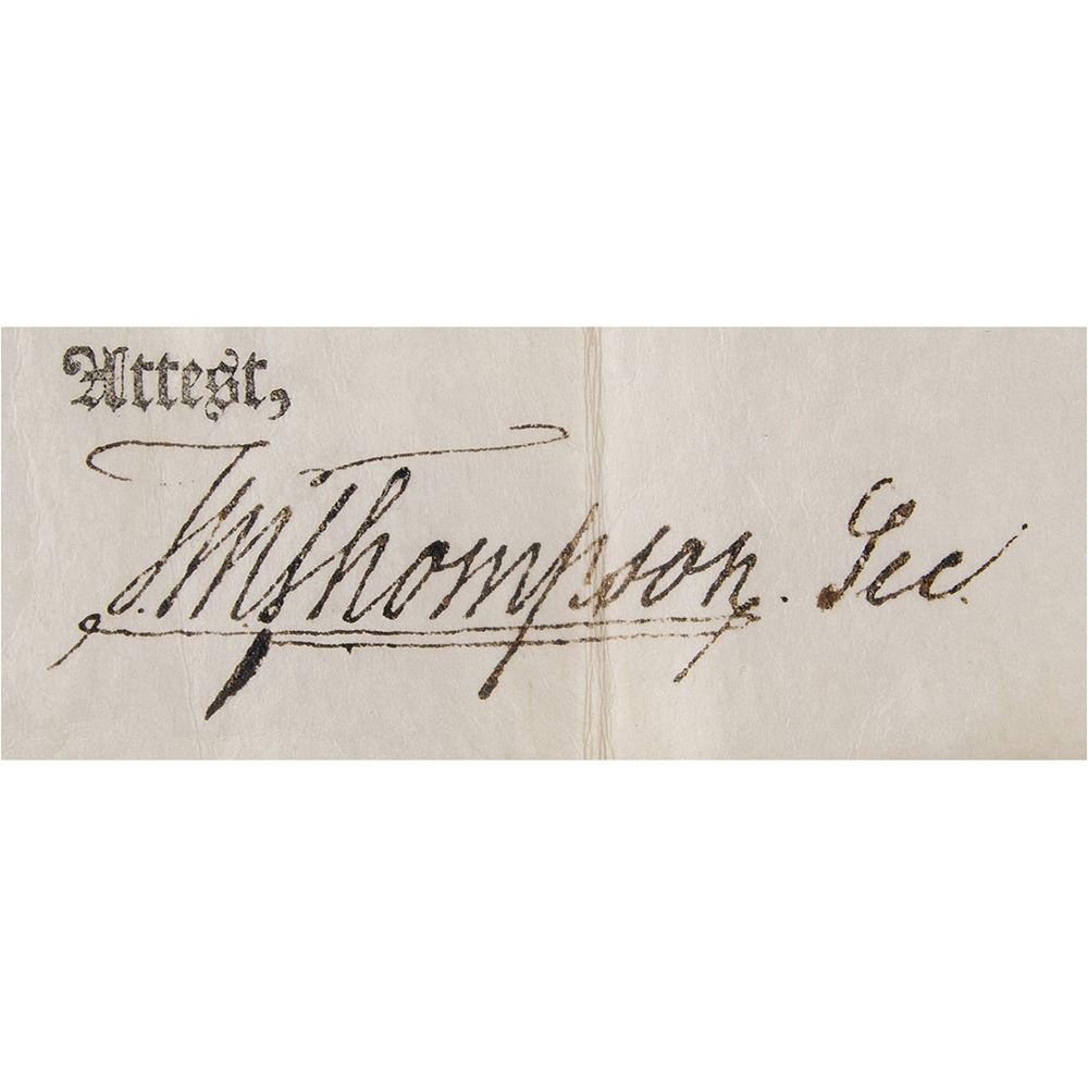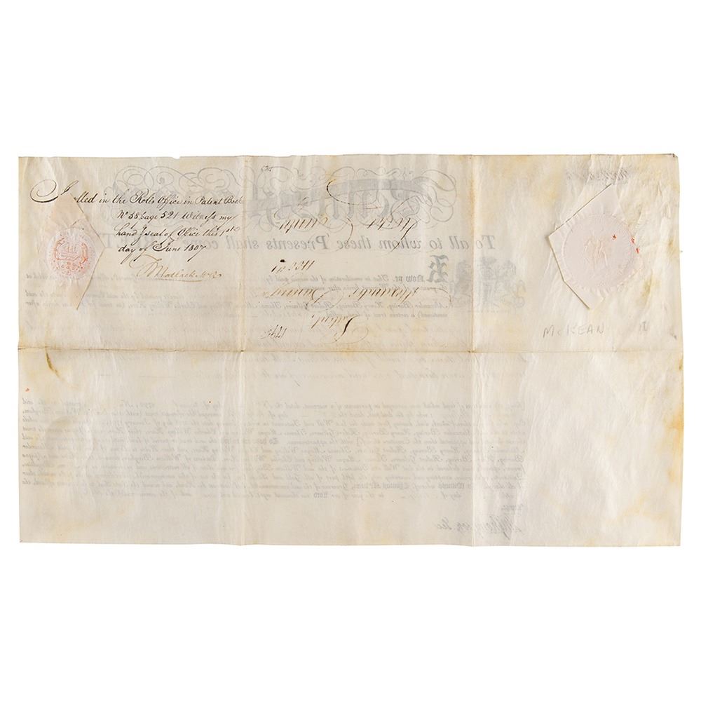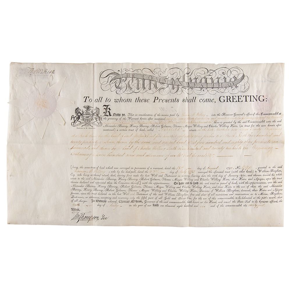 Signer of the Declaration of Independence from Delaware (1734-1817) who later served as president of the Continental Congress, Chief Justice of Pennsylvania, and Governor of Pennsylvania. Partly-printed vellum DS, signed “Tho. M:Kean,” one page, 20.5 x 12, August 18, 1792. As governor of Pennsylvania, McKean grants to Thomas M. Willing "a certain tract of land, called 'Ashfield,' situate in the late Buchan now Tioga County." Neatly signed in the upper left in ink by Governor McKean. The seal affixed to the upper left remains intact. Also endorsed on the reverse by Timothy Matlack, the engrosser of the Declaration of Independence. In fine condition.