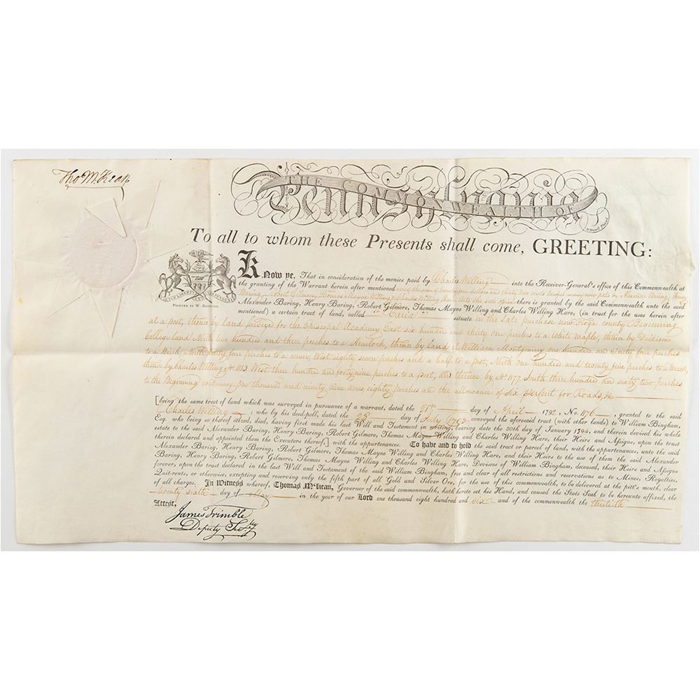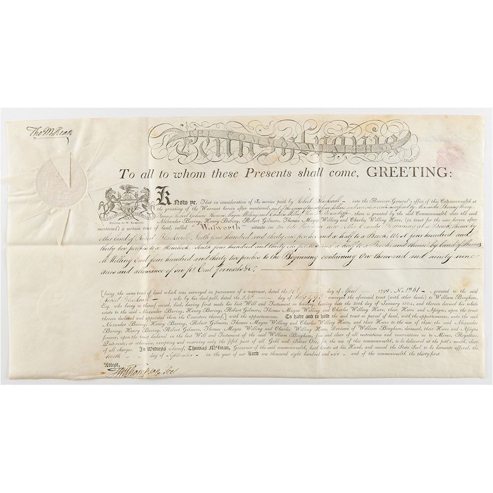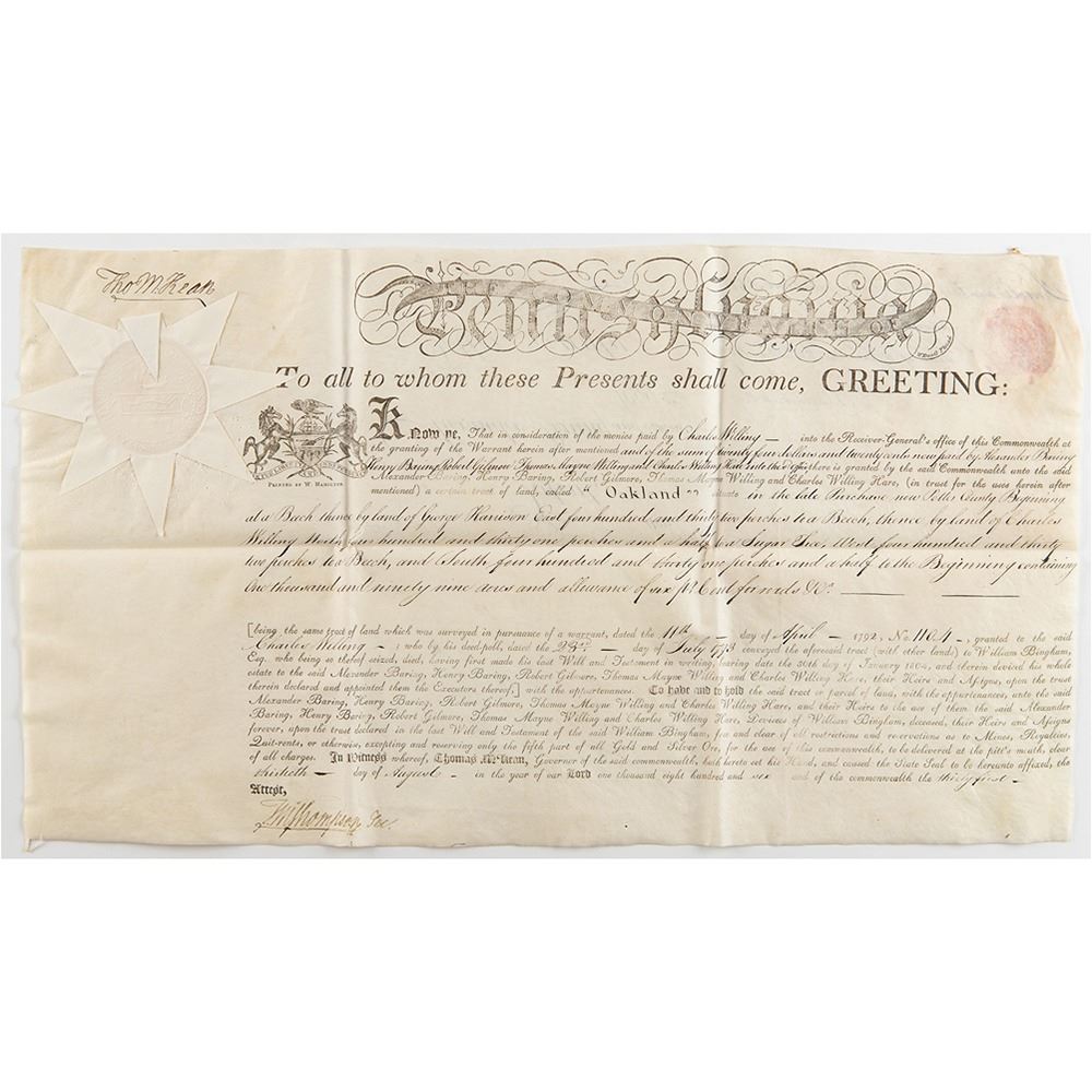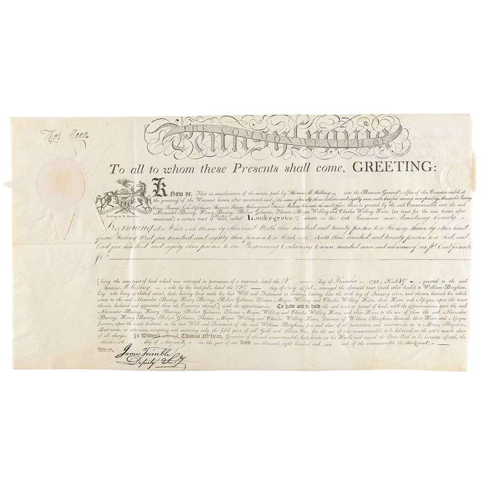 Signer of the Declaration of Independence from Delaware (1734-1817) who later served as president of the Continental Congress, Chief Justice of Pennsylvania, and Governor of Pennsylvania. Superb archive of 18 land grants signed "Tho. M:Kean" and "T. Matlack," all partly-printed on vellum, each one page, dated from May 1806 to October 1806. The documents, all issued to Alexander Baring and his partners, grant large tracts of land throughout Pennsylvania, with names like "Lamb's-Grove," "Oakland," "St. Cloud," "Caria," "Mountcharles," "Rhutupium," "Wilmington," "Franklin," "Camden," "Siota," "Edmond Hill," "Walworth," "Cambden," "Alnwick," "Berwick," "Eyrefield," "Edenderry," and "Eland." Each document is Signed in the upper left by Governor Thomas McKean and endorsed on the reverse by Timothy Matlack, the engrosser of the Declaration of Independence. All retain their complete, original paper seals. In overall fine condition. Taken as a whole, this is a remarkable, comprehensive archive of attractive and well-preserved early American documents.