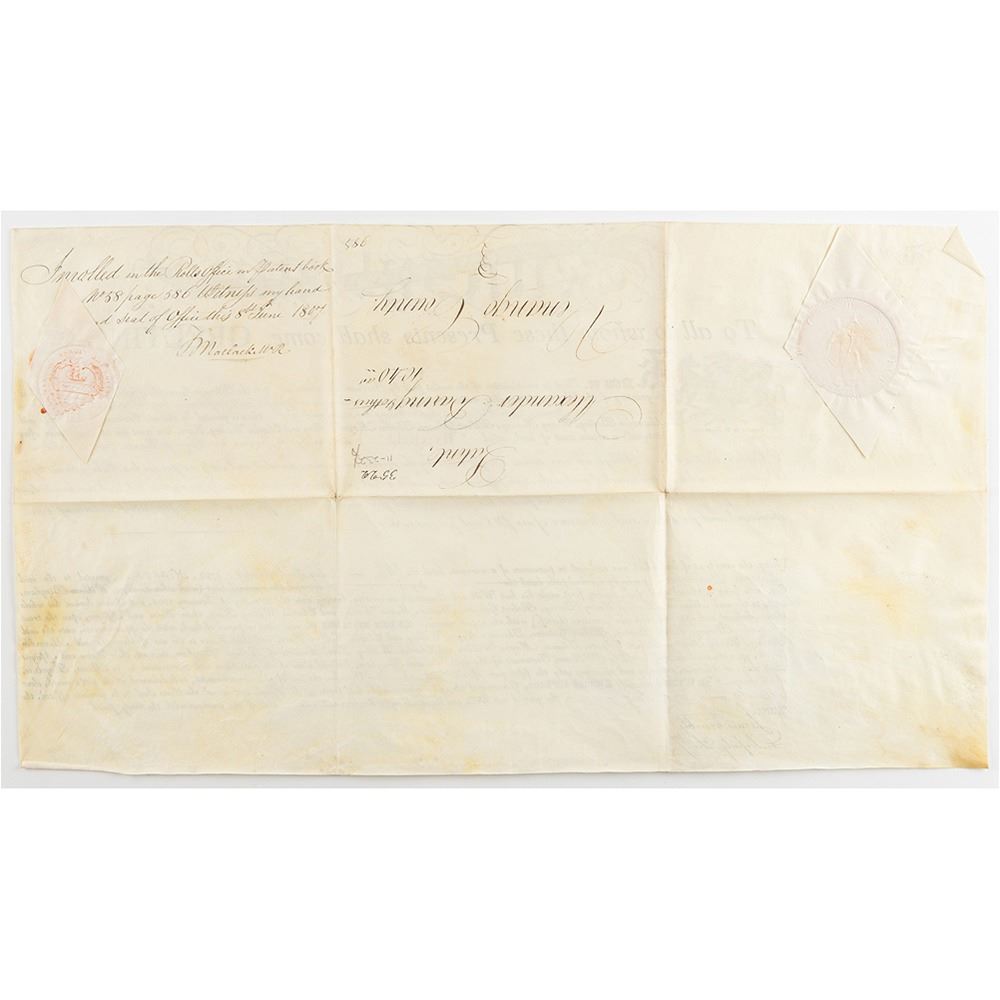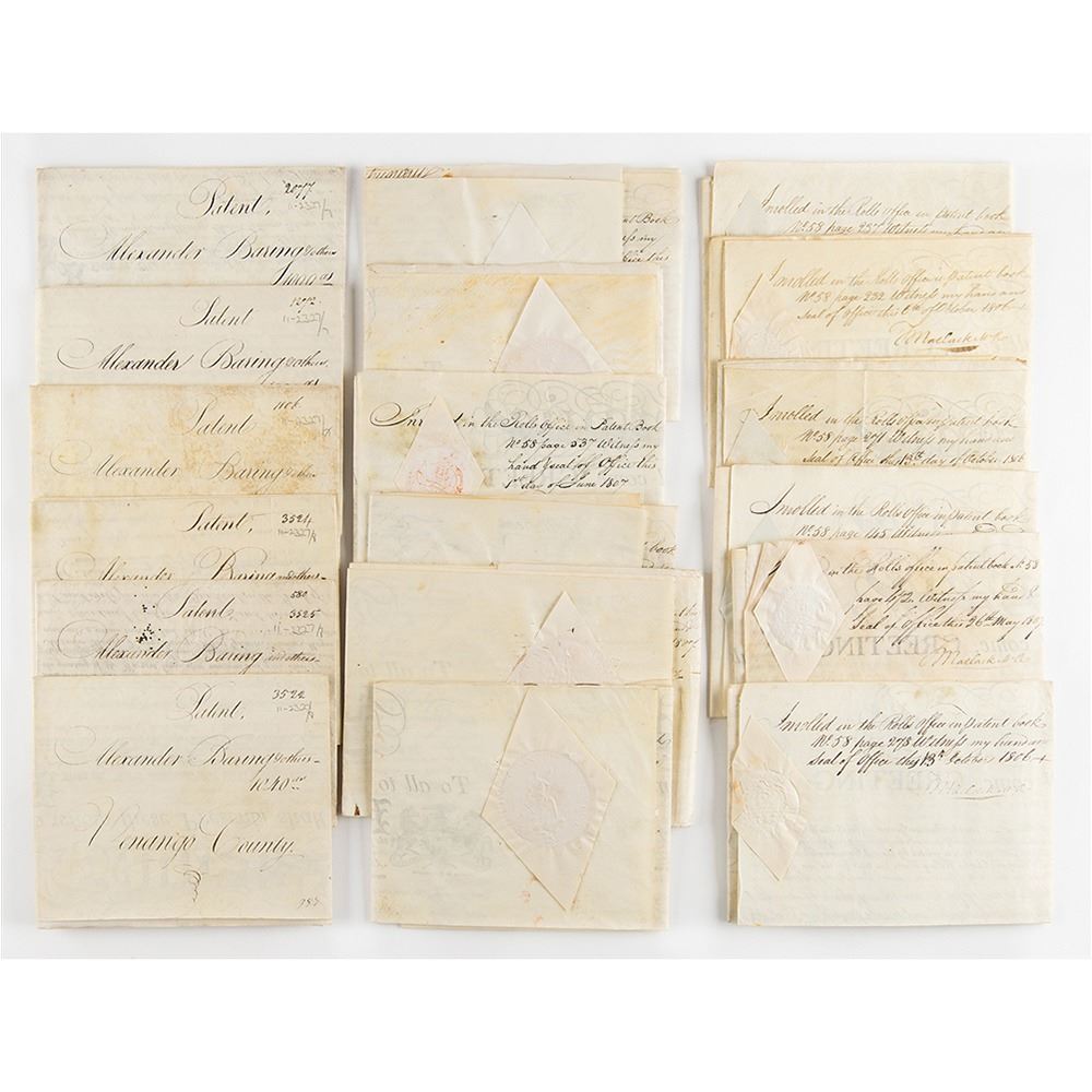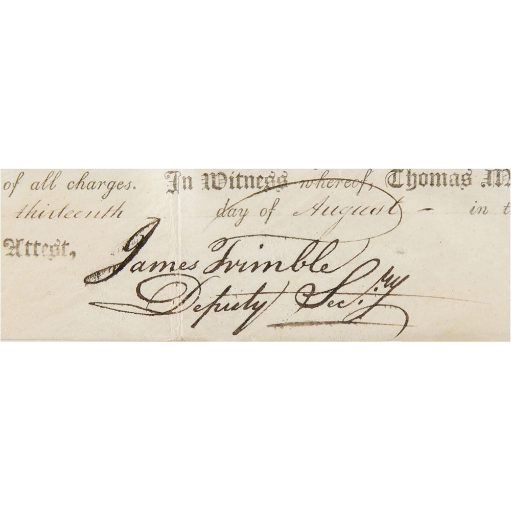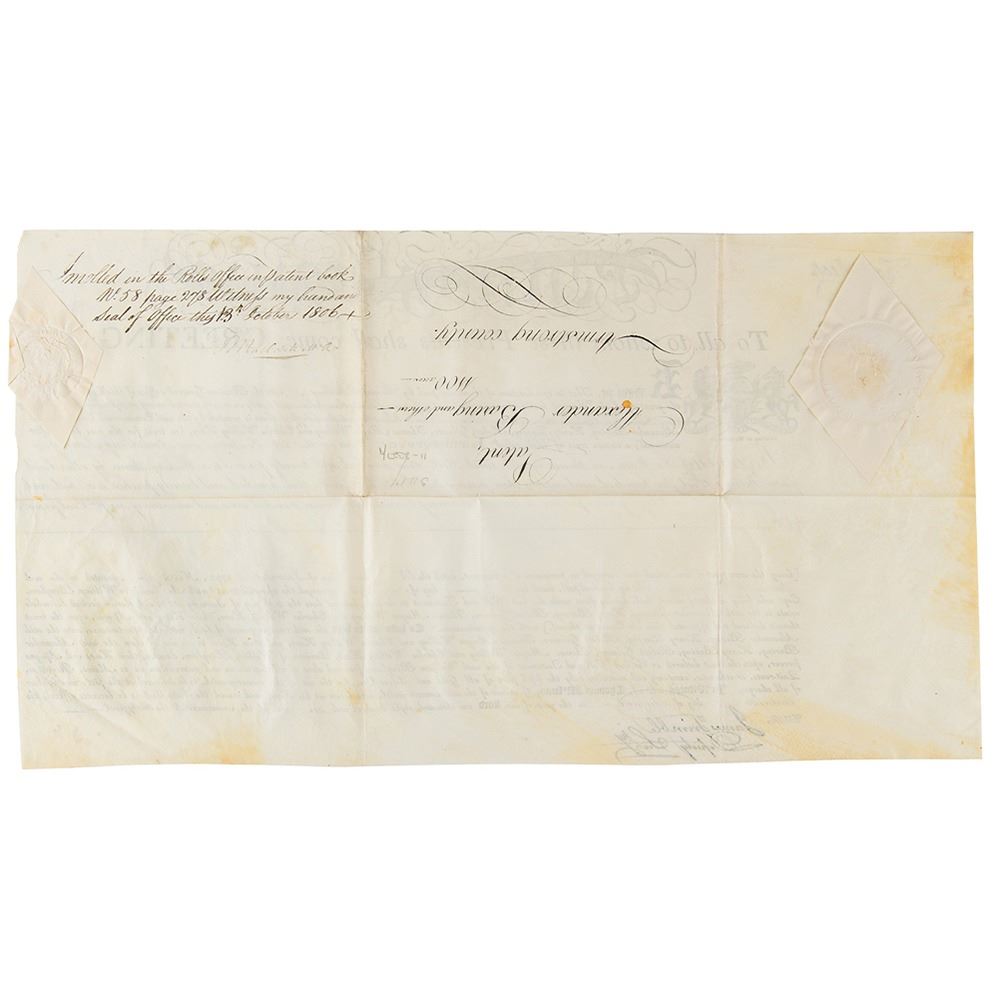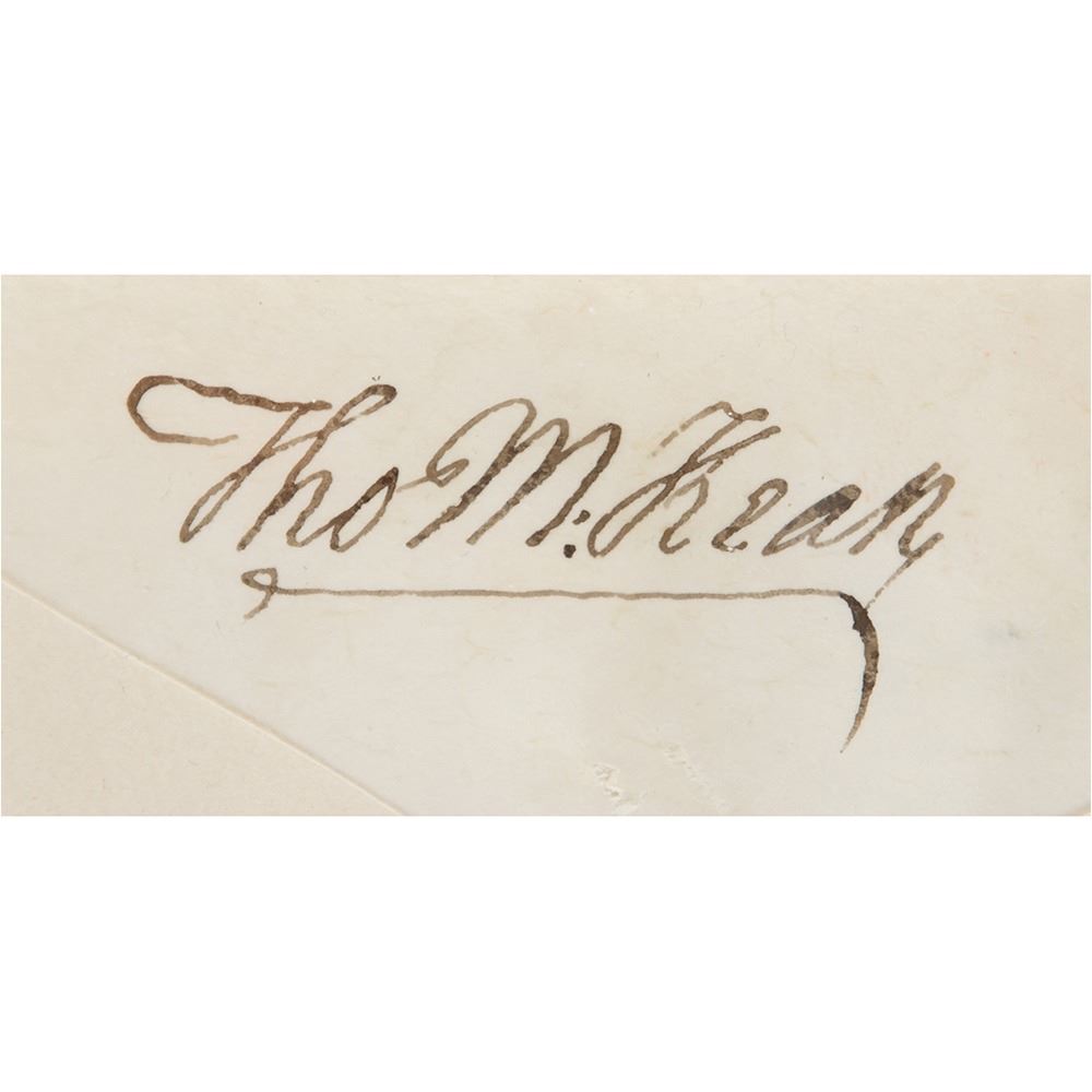 Signer of the Declaration of Independence from Delaware (1734-1817) who later served as president of the Continental Congress, Chief Justice of Pennsylvania, and Governor of Pennsylvania. Superb archive of 18 land grants signed "Tho. M:Kean" and "T. Matlack," all partly-printed on vellum, each one page, dated from May 1806 to October 1806. The documents, all issued to Alexander Baring and his partners, grant large tracts of land throughout Pennsylvania, with names like "Lamb's-Grove," "Oakland," "St. Cloud," "Caria," "Mountcharles," "Rhutupium," "Wilmington," "Franklin," "Camden," "Siota," "Edmond Hill," "Walworth," "Cambden," "Alnwick," "Berwick," "Eyrefield," "Edenderry," and "Eland." Each document is Signed in the upper left by Governor Thomas McKean and endorsed on the reverse by Timothy Matlack, the engrosser of the Declaration of Independence. All retain their complete, original paper seals. In overall fine condition. Taken as a whole, this is a remarkable, comprehensive archive of attractive and well-preserved early American documents.