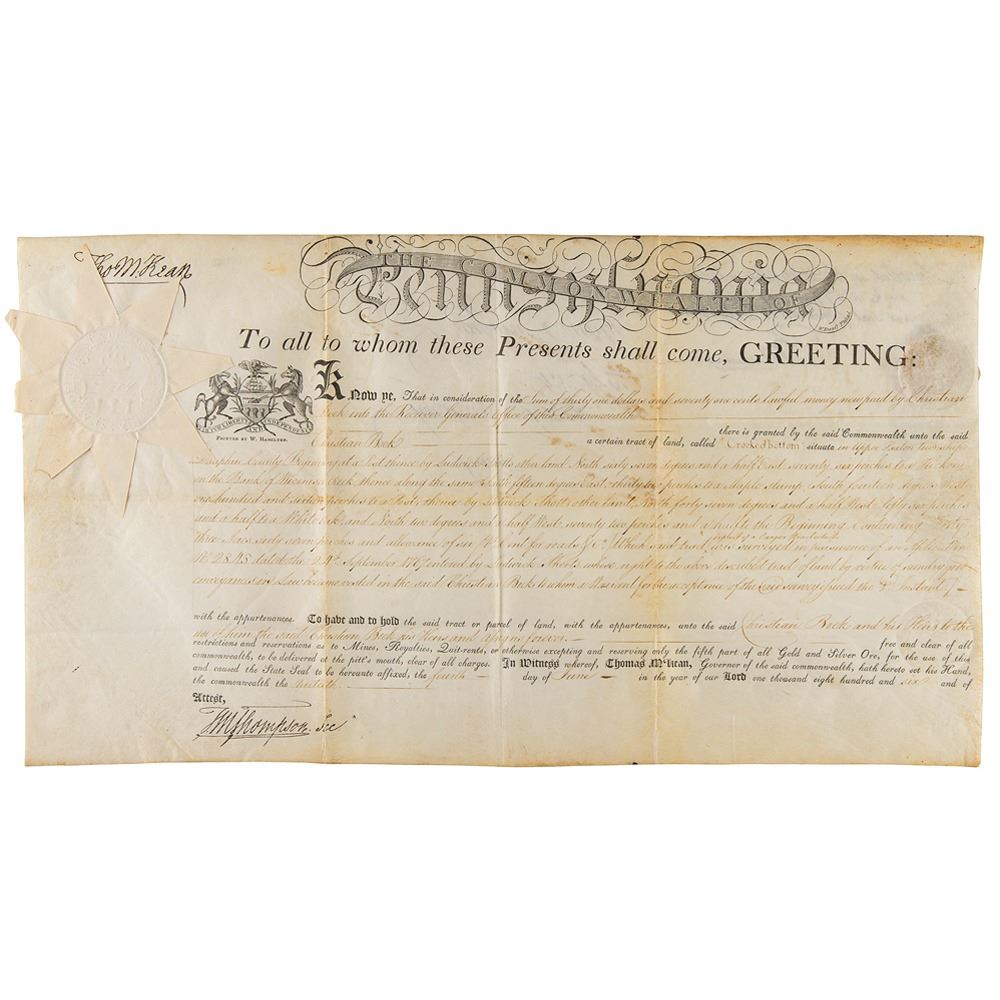 Partly-printed vellum DS, signed “Tho's M:Kean,†one page, 20.5 x 11.25, June 4, 1806. As governor of Pennsylvania, McKean grants Christian Bock "a certain tract of land, called 'Crookedbottom'…containing Forty three Acres sixty seven perches." Signed in the upper left by Governor Thomas McKean. The seal affixed to the upper left remains intact. Also endorsed on the reverse by Timothy Matlack, the engrosser of the Declaration of Independence. In fine condition, with light toning along the intersecting folds.