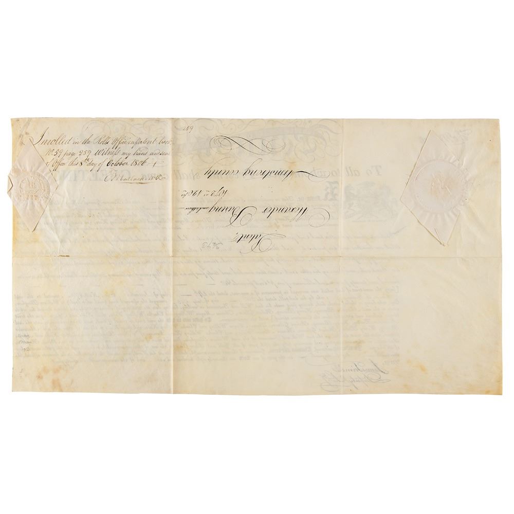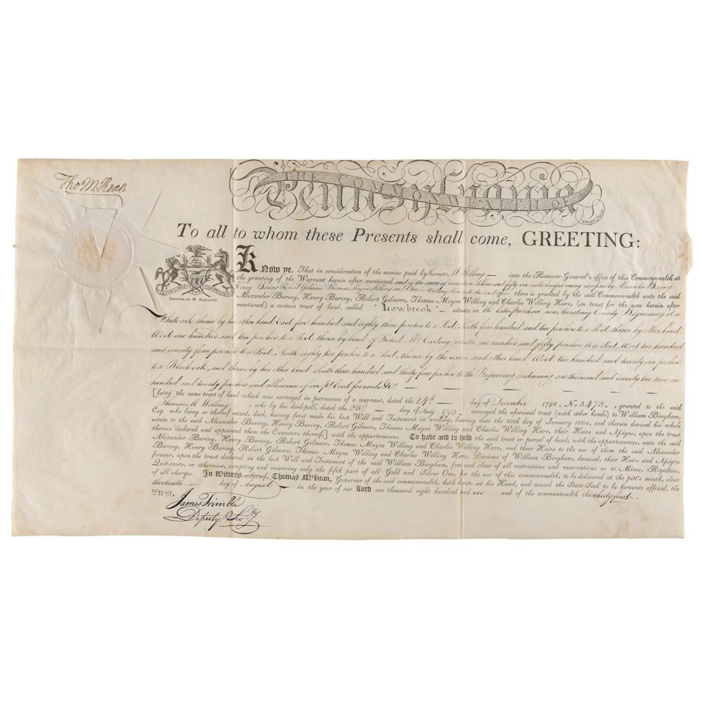 Signer of the Declaration of Independence from Delaware (1734-1817) who later served as president of the Continental Congress, Chief Justice of Pennsylvania, and Governor of Pennsylvania. Partly-printed vellum DS, signed “Tho. M:Kean” and "T. Matlack," one page, 20.5 x 11.75, August 13, 1806. Document granting Alexander Baring, Henry Baring, Robert Gilmore, Thomas Mayne Willing and Charles Willing Hare “certain tract of land called ‘Lowbrook’ situate in the late purchase now Armstrong County.” Signed in the upper left by Governor McKean and countersigned below by James Trimble as deputy secretary. Also endorsed on the reverse by Timothy Matlack, the engrosser of the Declaration of Independence. Document retains its embossed paper seal affixed to the upper left. In fine condition.
