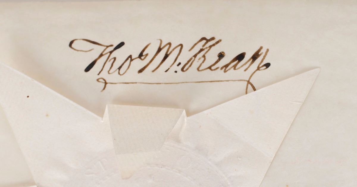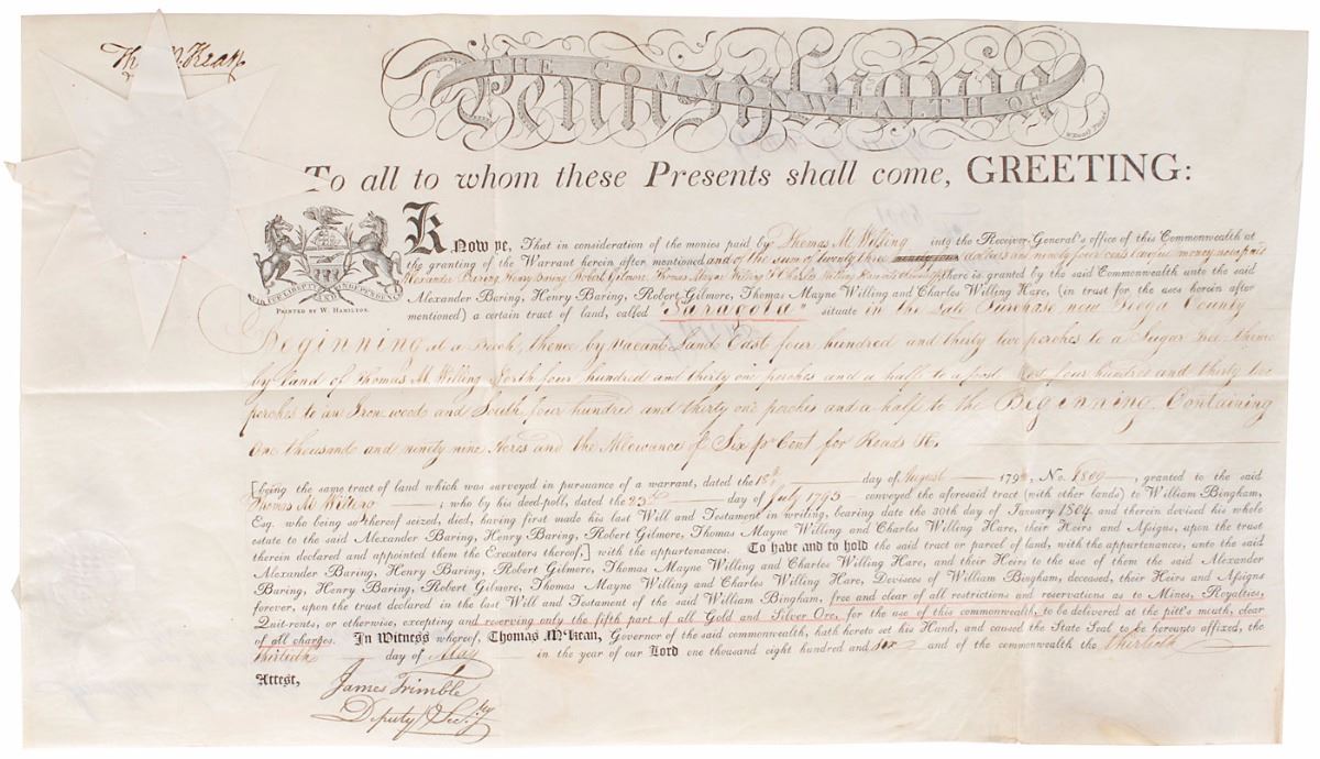 Signer of the Declaration of Independence from Delaware (1734–1817) who later served as president of the Continental Congress, Chief Justice of Pennsylvania, and Governor of Pennsylvania. Partly-printed vellum DS, signed “Tho. M:Kean,” one page, 20.5 x 11.75, May 30, 1806. As governor of Pennsylvania, McKean grants Thomas M. Willing “a certain tract of land, called ‘Saragota’ situate in…Tioga County…containing One thousand and ninety nine Acres.” Boldly signed in the upper left corner by Governor McKean. Also signed on the reverse by Timothy Matlack, the engrosser of the Declaration of Independence. The crisp white paper seal affixed to the upper left remains fully intact. In fine condition. An exceptionally well-preserved example.