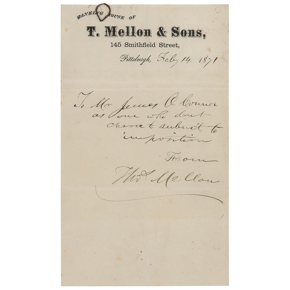 American entrepreneur, lawyer, and judge (1813–1908) best known as the founder of Mellon Bank. ALS signed “Thos. Mellon,” one page, 4.75 x 8, T. Mellon & Sons letterhead, February 14, 1871. Handwritten letter, in full: "To Mr. James O. Connor, as one who don't choose to submit to imposition." In fine condition, with a vintage circular paperclip to the top edge.