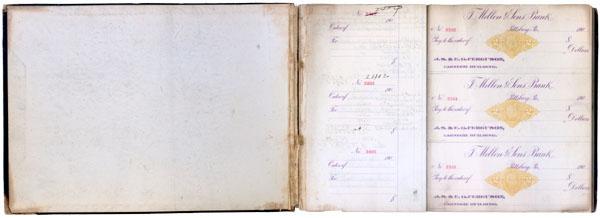 14” x 10” ledger containing check #s 2533 to 2895 in “T. Mellon & Sons Bank.” Three checks per a page. Yellow “United States Internal Revenue Documentary Stamp” at center. soiling and edge wear on some checks. Overall Very Good.