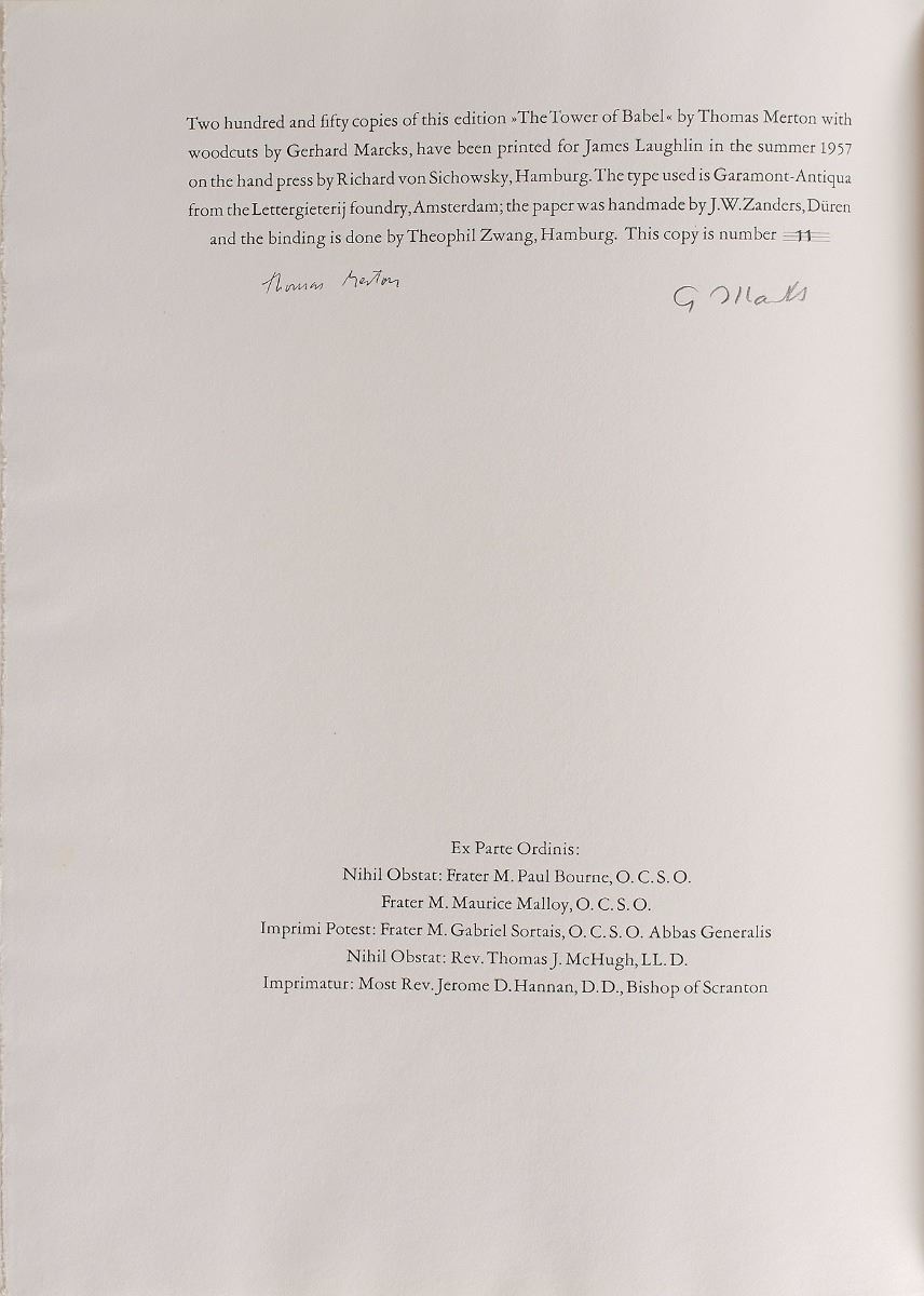Catholic writer and mystic (1915–1989) known for his bestselling autobiography The Seven Storey Mountain. Signed book: The Tower of Babel. Limited edition, numbered 11/250. NY: New Directions, 1957. Hardcover with slipcase, 10.5 x 15.5, 31 pages. Signed on the colophon in ink by Merton, “Thomas Merton,” and in pencil by the artist Gerhard Marcks, “G. Marcks.” In fine condition. Another example of this gorgeous limited edition is held by the Museum of Modern Art in New York—a highly sought-after book and scarce autograph in combination.