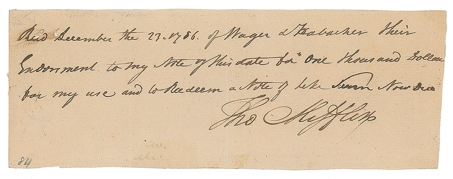 Manuscript DS, signed “Tho. Mifflin,” one page, 8 x 3, December 23, 1786. Payment receipt, which reads: "Rec'd December the 23rd 1786 of Wager & Habacker their Endorsement to my Note of this date for One thousand Dollars for my use and to Redeem a Note of like Sum." Signed prominently at the conclusion by Mifflin. In fine condition. Mifflin served as Speaker of the Pennsylvania House of Representatives from 1785 to 1787.