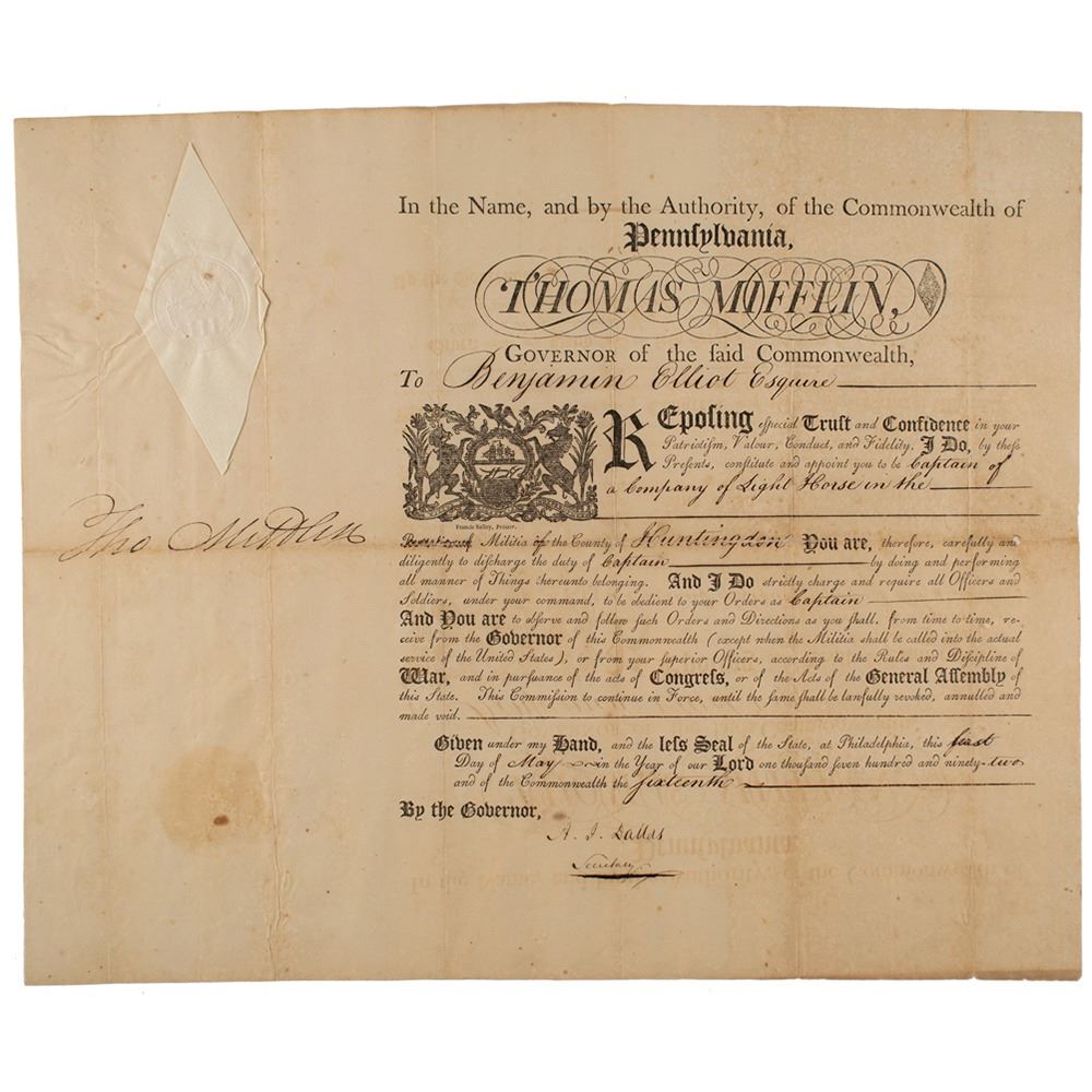 Partly-printed DS, signed “Tho. Mifflin,†one page, 15.5 x 13, May 1, 1792. As governor of Pennsylvania, Mifflin appoints Benjamin Elliot "to be Captain of a Company of Light Horse in the Militia of the County of Huntingdon." Boldly signed on the left side by Governor Mifflin, and countersigned at the conclusion by Alexander J. Dallas as secretary. The white paper seal affixed to the upper left remains intact. In very good to fine condition, with a seal-related stain to the lower left, and archival tape repair to complete separation to the central horizontal fold.
