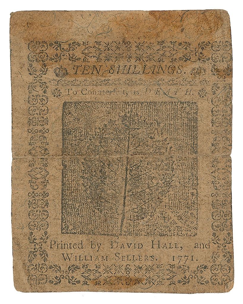 Colonial Pennsylvania engraved bank note for "Ten Shillings," signed “Tho. Mifflin,” 3 x 3.75, issued as No. 1095, and reading: “This Indented Bill of Ten Shillings, shall entitle the Bearer to receive of the Provincial Treasurer, the like Sum of Ten Shillings, of equal Value with the same Sum, of the Bills of Credit now by law current, according to the Directions of an Act of General Assembly of Pennsylvania, made in the 11th Year of the Reign of his Majesty Geo. III. Dated March 20, 1771.” Signed at the conclusion by Thomas Mifflin, and countersigned by Joel Evans and Joseph Morris. Printed by David Hall and William Sellers, with reverse bearing the cautionary message: "To Counterfeit is Death." In very good condition, with a central horizontal fold, creasing, and overall wear.