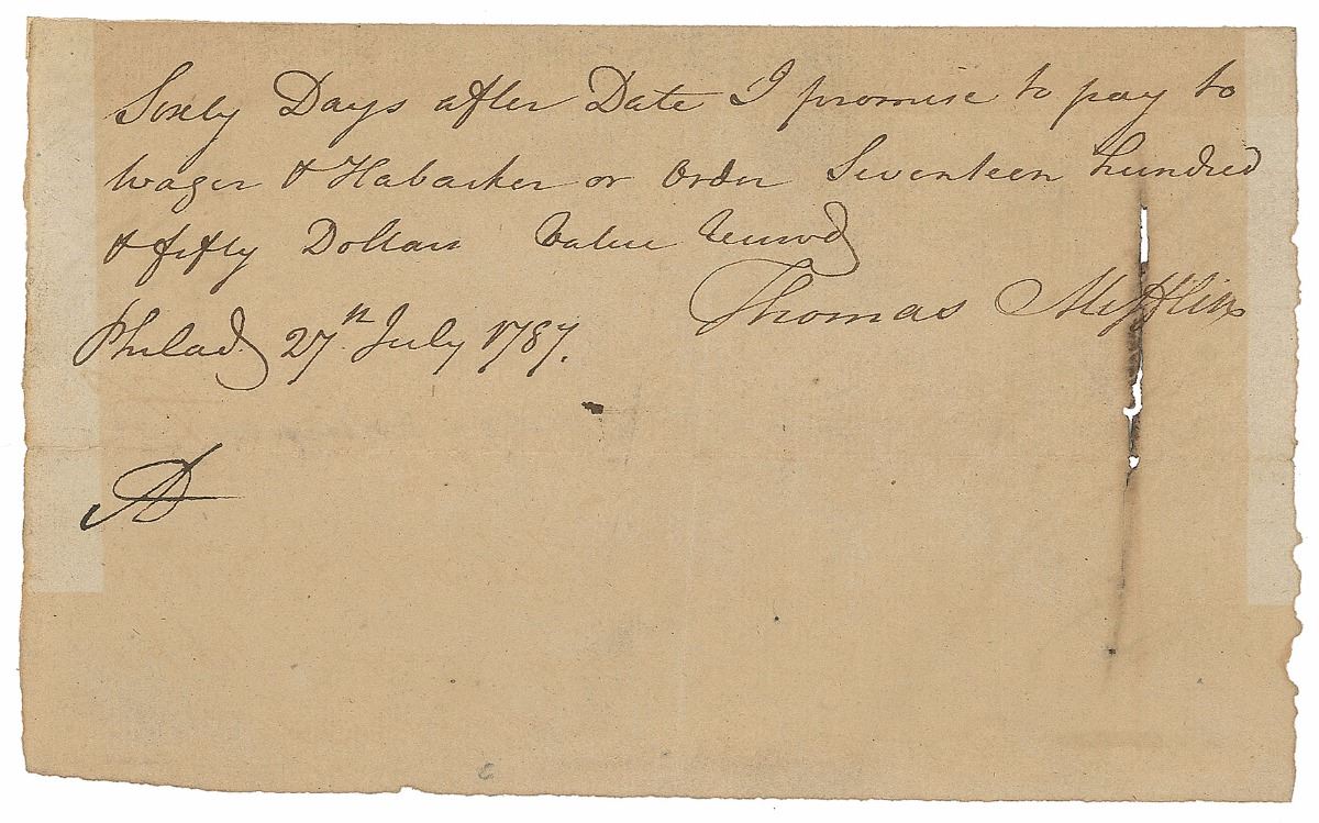 Signer of the US Constitution from Pennsylvania (1744–1800) and first governor of that state. Manuscript DS, signed “Thomas Mifflin,” one page, 6.5 x 4, July 27, 1787. Promissory note, in part: “Sixty days after Date I promise to pay to Wager J. Habacker or Order Seventeen hundred & fifty Dollars.” In very good condition.