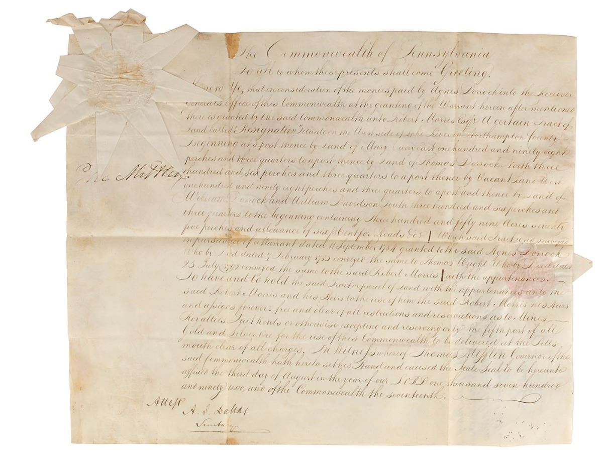 Signer of the US Constitution from Pennsylvania (1744–1800) and first governor of that state. Manuscript vellum DS, signed “Tho Mifflin,” one page, 15.5 x 12.5, August 3, 1792. As governor of Pennsylvania, Mifflin grants Robert Morris “a certain Tract of Land called ‘Resignation’…containing Three hundred and fifty nine Acres.” Signed in the upper left below the eight-point seal by Mifflin. In very good to fine condition, with a few small areas of staining.