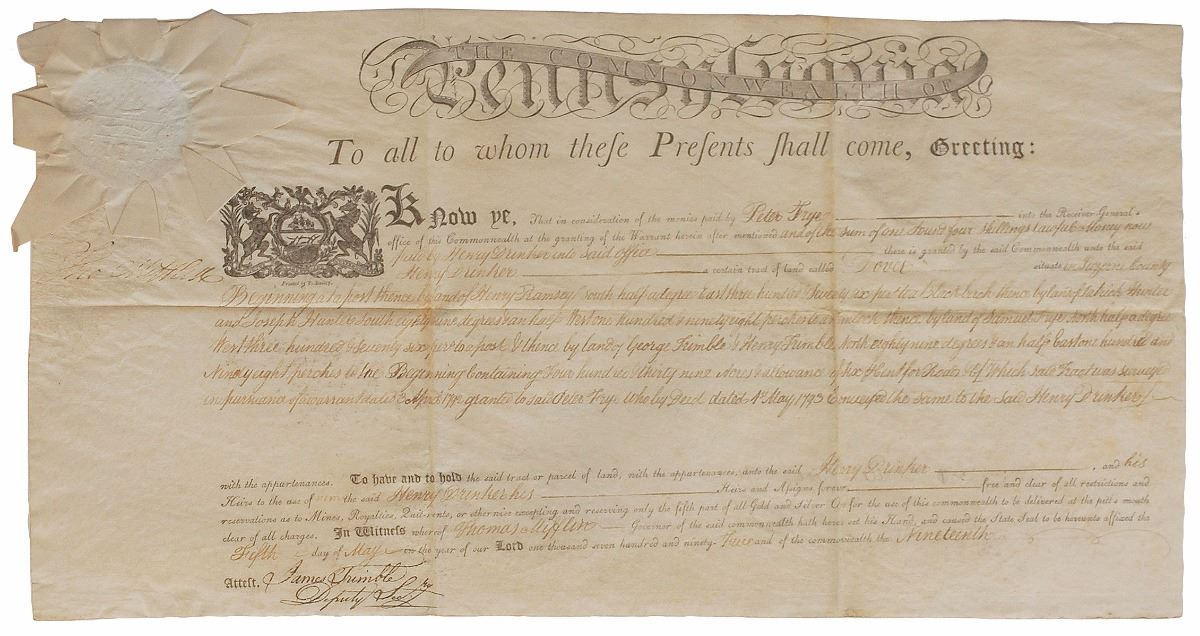 Signer of the US Constitution from Pennsylvania (1744–1800) and first governor of that state. Partly-printed vellum DS, signed “Tho. Mifflin,” one page, 20.75 x 11, May 5, 1793. As governor of Pennsylvania, Mifflin grants Henry Drinker "a certain tract of land called Dover situate in Luzerne County." Signed in the upper left below the eight-point seal by Mifflin, and countersigned at the conclusion by Deputy Secretary James Trimble. In fine condition, with the signature light but legible. Pre-certified PSA/DNA.