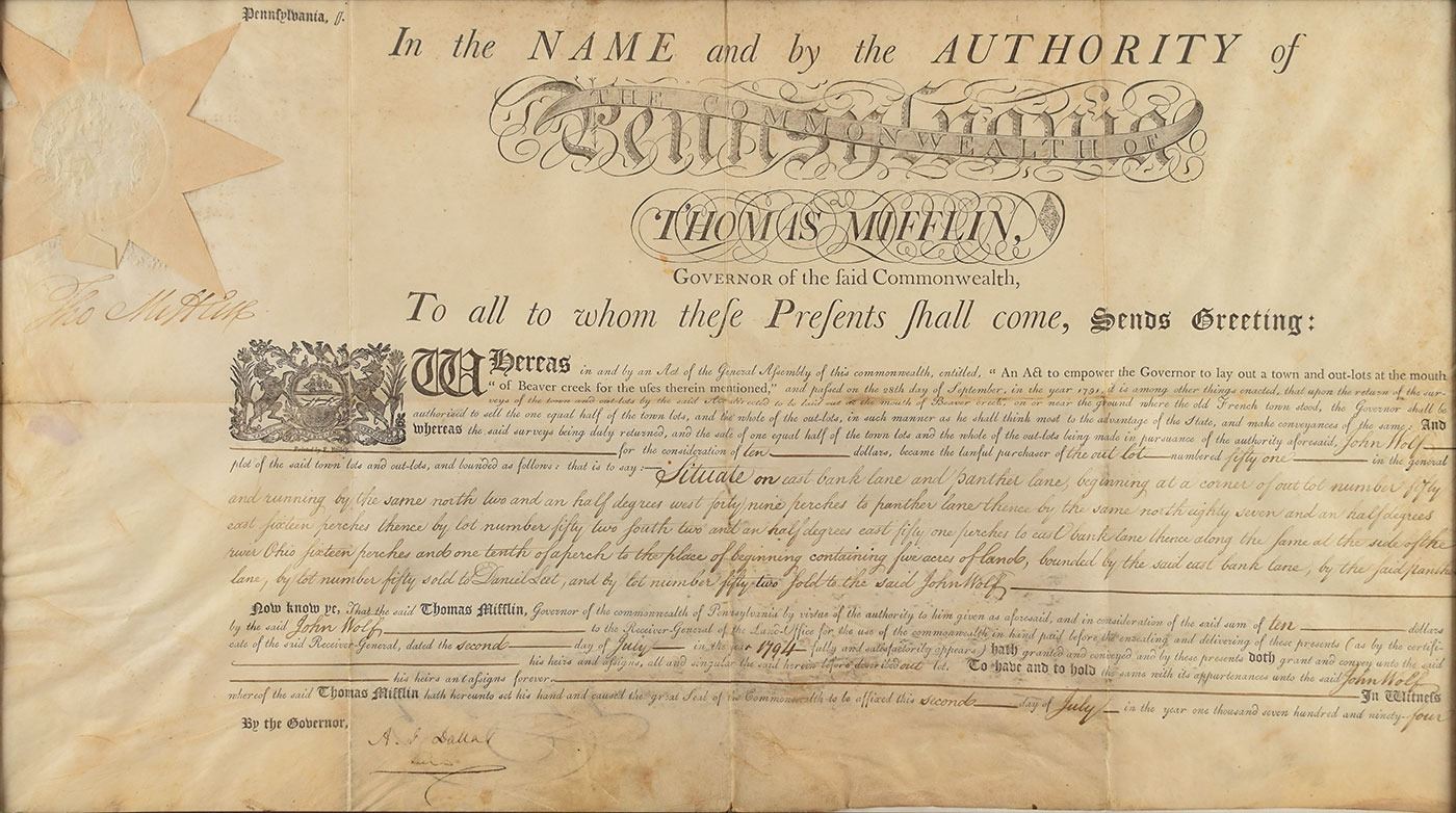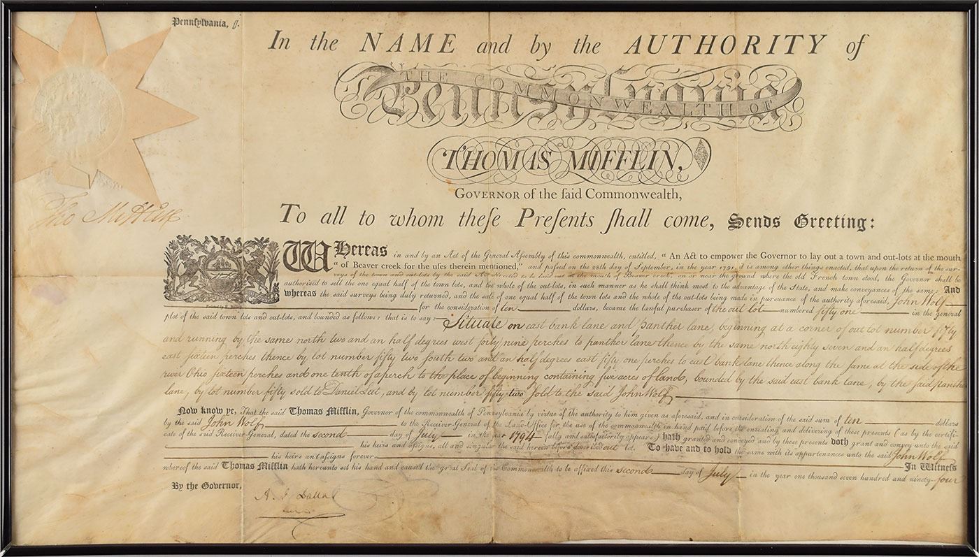 Signer of the US Constitution from Pennsylvania (1744–1800) and first governor of that state. Partly-printed vellum DS, signed “Tho. Mifflin,” one page, 23.5 x 13.25, July 2, 1794. Governor Mifflin grants John Wolf a parcel "containing five acres of lands." Signed in the upper left corner by Governor Mifflin, and countersigned at the conclusion by Alexander J. Dallas as secretary. The white paper seal affixed to the upper left remains intact. Framed and in very good to fine condition, with creasing, wrinkling, and toning to the lower half of the document.