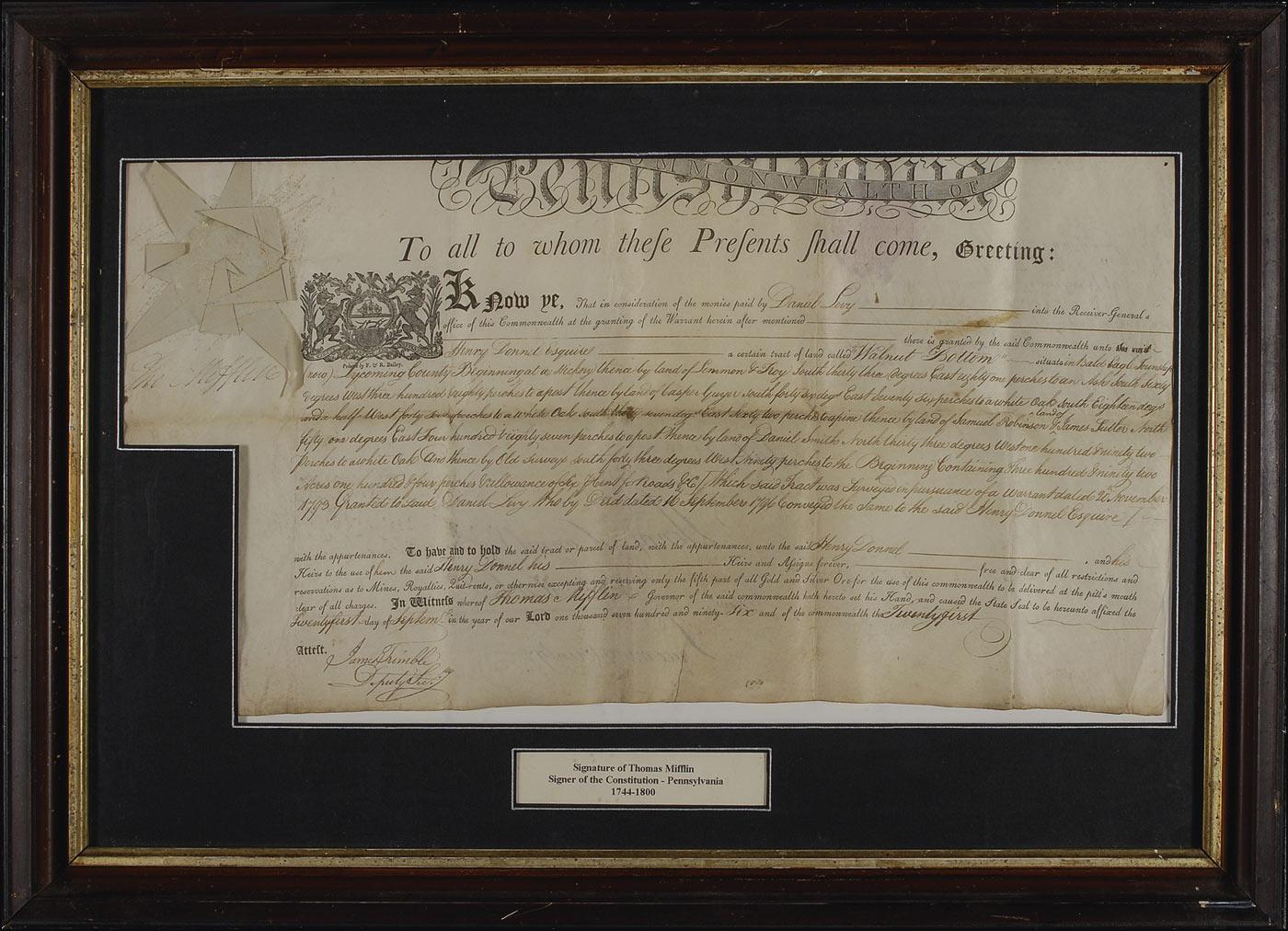 Signer of the US Constitution from Pennsylvania (1744–1800) and first governor of that state. Partly-printed DS, signed “Tho. Mifflin,” one-page, 20.5 x 11, September 21, 1796. Governor Mifflin grants Daniel Levy 392 acres of land called Walnut Bottom, signed on the left side “Tho. Mifflin,” under the official seal. Matted and framed to an overall size of 24.5 x 17.5. In very good condition, with intersecting folds, scattered light toning and soiling, some light creasing and wrinkling, and signature a shade or two light, but completely legible. The embossed eight-point paper seal is worn, but intact. Oversized. Pre-certified PSA/DNA and RRAuction COA.