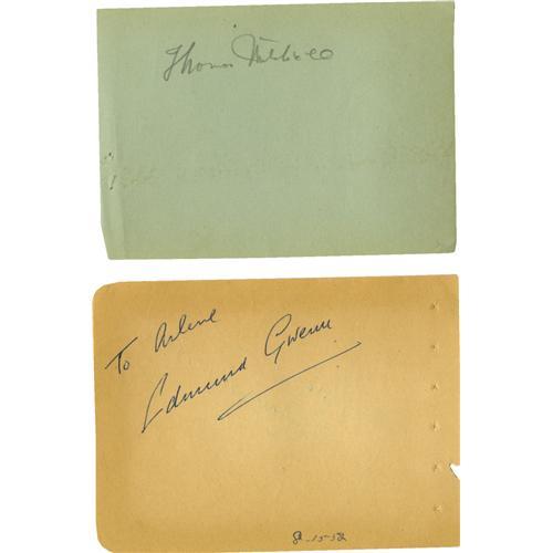 <B>Thomas Mitchell and Edmund Gwenn Autographs.</B></I> A pair of autograph album pages signed by Mitchell and Gwenn in pencil and blue ink, respectively. In Very Fine condition with mild wear and tanning around the edges. <I>Accompanied by LOA from PSA/DNA.</B></I><BR><BR><b>Shipping:</b> Flat Material, Small (<a target="_blank" href="http://www.heritageauctions.com/common/shipping.php">view shipping information</a>)