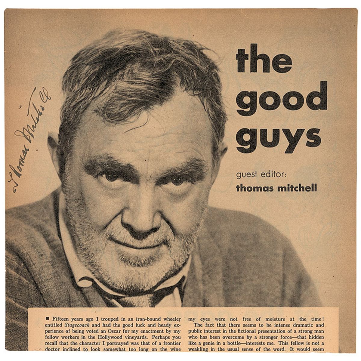 Vintage magazine photo, trimmed to a size of 8 x 8, signed in fountain pen, “Thomas Mitchell.” In fine condition, with a few small tears along the top edge. Accompanied by an unsigned glossy photo of Mitchell and Olivia de Havilland from Gone With the Wind.