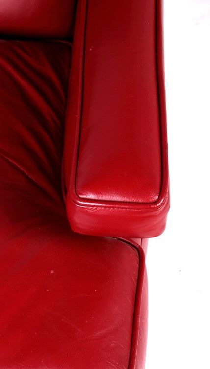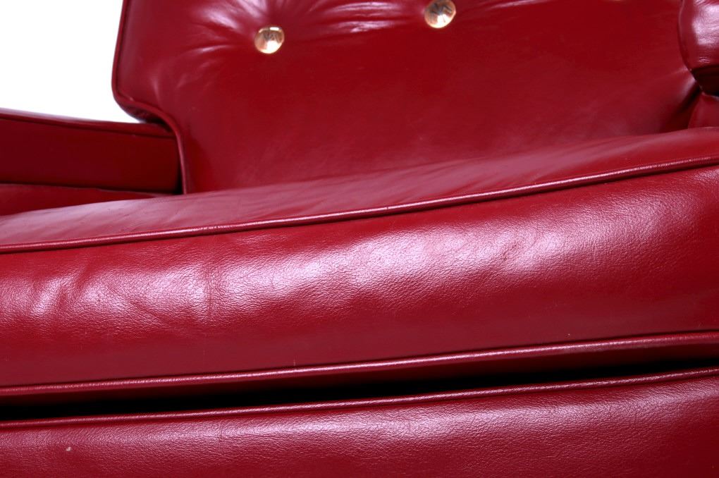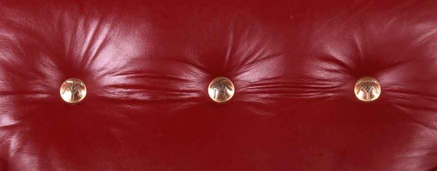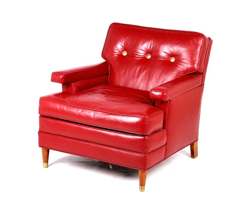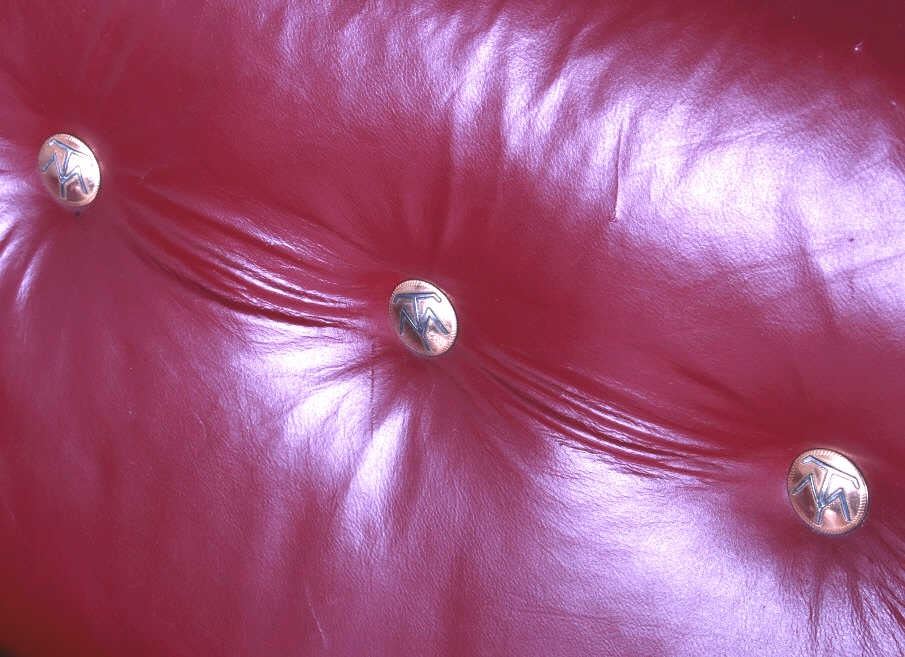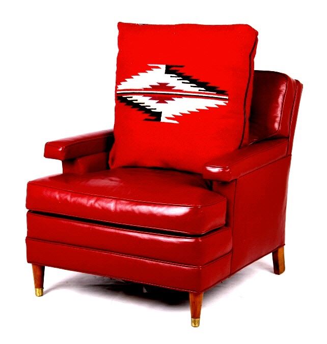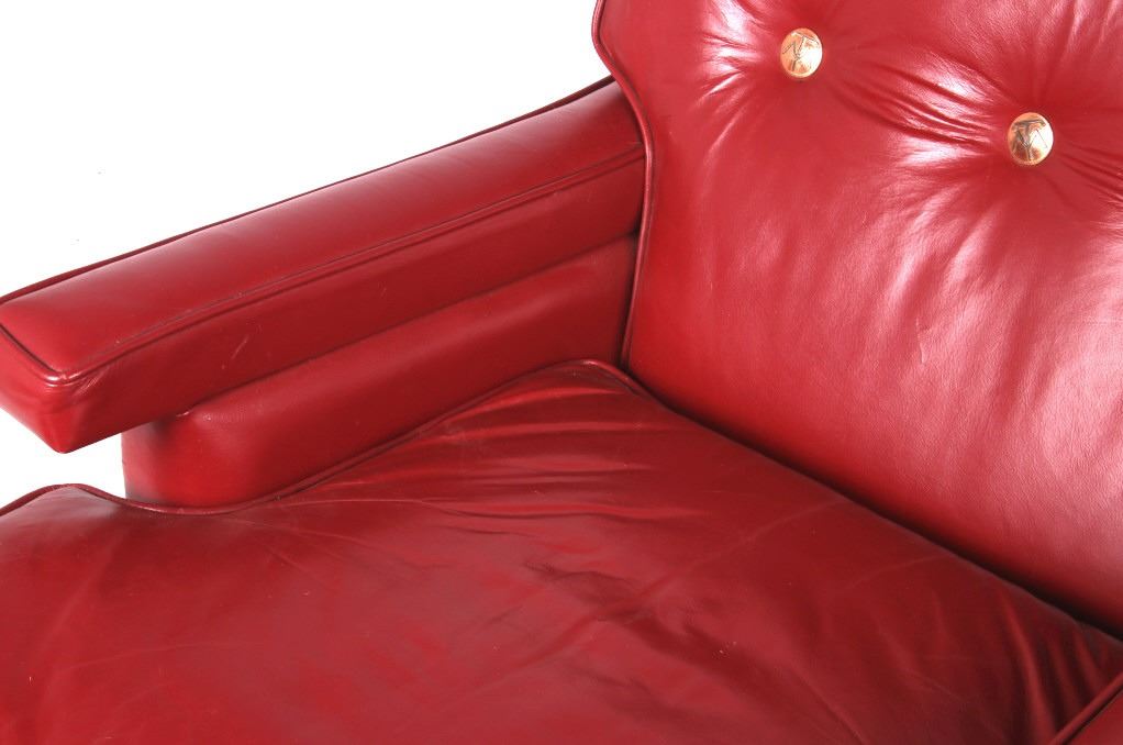 The lot features an early circa 1940’s leather arm-chair that has been attributed as being the personal chair of Thomas Molesworth. The chair shows the Molesworth red color and is adorned with three handmade copper and sterling silver buttons with the “TM” Thomas Molesworth brand (T / M). The piece was purchased from a prominent antiques shop in Jackson Hole, Wyoming were it was attributed as being the personal chair of Thomas Molesworth. The chair is believed to have been altered by the hand of Molesworth with these custom crafted buttons or concho’s and dating to circa 1940’s. Thomas C. Molesworth (American 1890-1977) was an innovative designer who was significant in the creation of a distinctly Western style of furniture using hides, horns and natural wood creating the “cowboy furniture” style. He originally managed the Rowe Furniture Company in Billings, Montana in the early 1900’s before moving his family to Cody, Wyoming in 1931. Molesworth furnished some of the most significant ranches, homes and hotels around the country including President Dwight D. Eisenhower’s home. Molesworth furniture is the most sought after in western collecting with such examples from the O.T.O. Ranch in Montana selling for $225,000 at auction for the game table sold by Sotheby’s on May 23rd 2018 and the club chair that sold for $137,500 at the same sale. Provenance: From the Ladder Ranch & Diamond Bar 7 Brand located just East of Big Timber, Montana near the Montana Crazy Mountains. A Thomas Molesworth hand crafted chair with a similar style called the "Tub Chair" sold at the Sotheby's May 2018 sale for $10,625, the chair shows a similar style of manufacture and design as the chair represented in this lot.