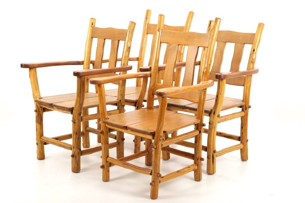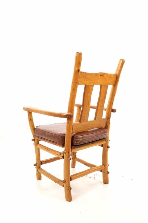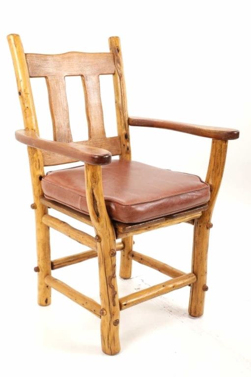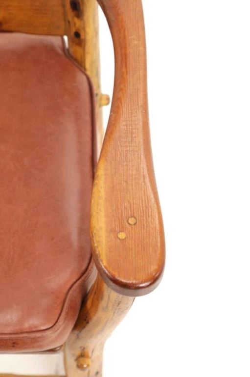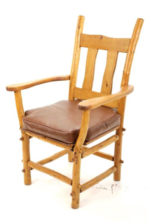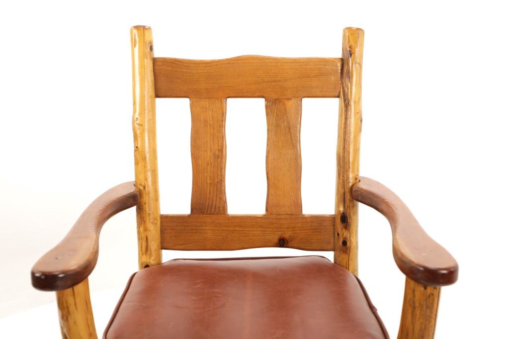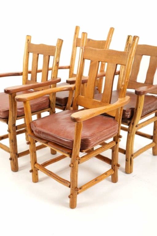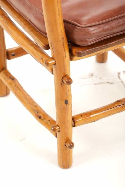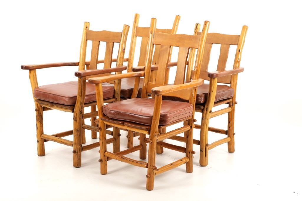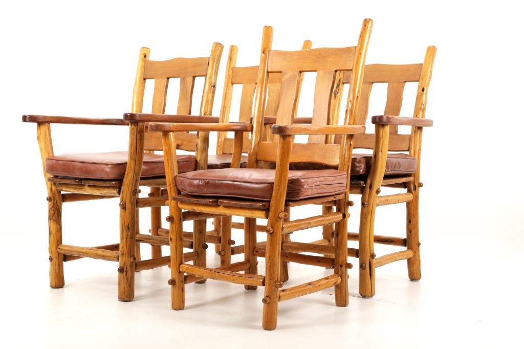 This is a fantastic, custom handmade Thomas Molesworth style set of four log and leather cushion chairs. The chairs are all handmade and truly high quality furniture from Jackson Hole or Cody, Wyoming. The set shows the classic log furniture style first made popular by Thomas Molesworth (1890-1977). These are signed on the bottom with a branded / burned bear with “S” at the center. Thomas Molesworth is known for creating the iconic Western Cowboy and Cabin style. The four chairs measure approximately 42" tall by 24 1/2" wide and 20 1/2" deep.*