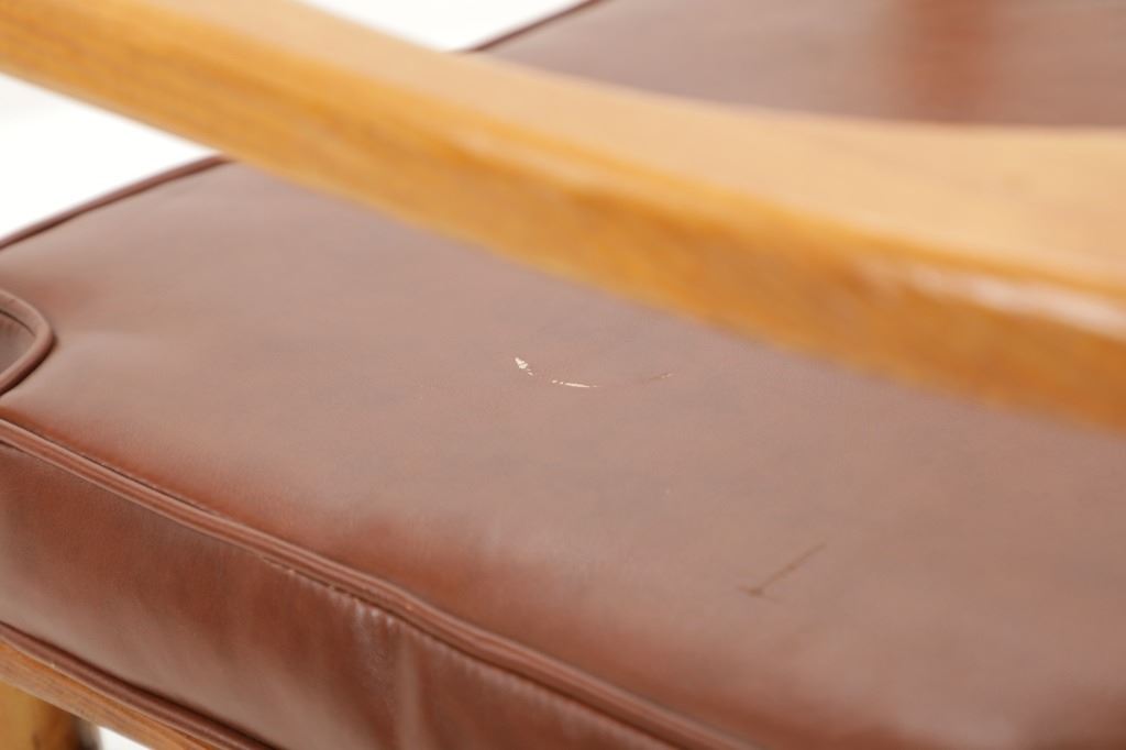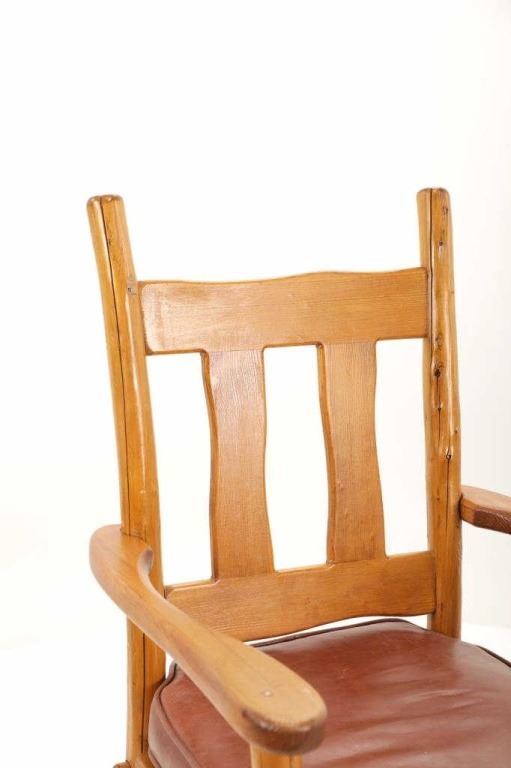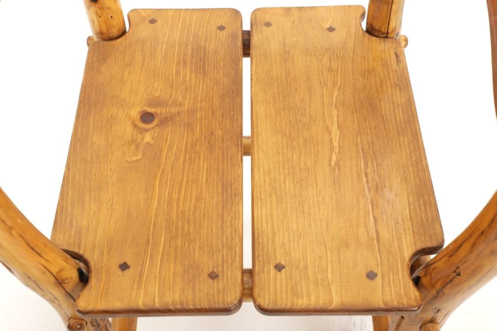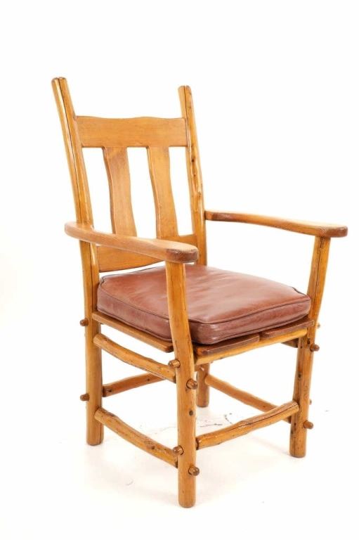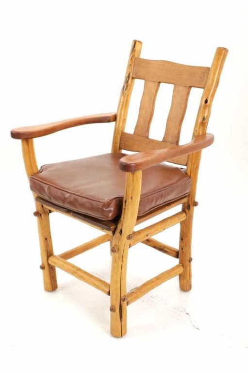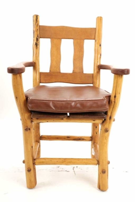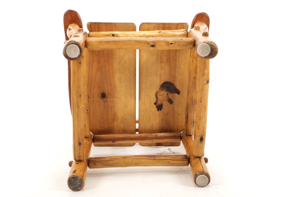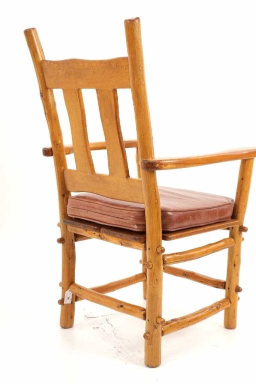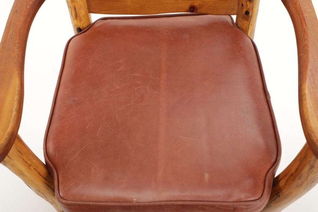 This is a fantastic, custom handmade Thomas Molesworth style set of four log and leather cushion chairs. The chairs are all handmade and truly high quality furniture from Jackson Hole or Cody, Wyoming. The set shows the classic log furniture style first made popular by Thomas Molesworth (1890-1977). These are signed on the bottom with a branded / burned bear with “S” at the center. Thomas Molesworth is known for creating the iconic Western Cowboy and Cabin style. The four chairs measure approximately 42" tall by 24 1/2" wide and 20 1/2" deep.*