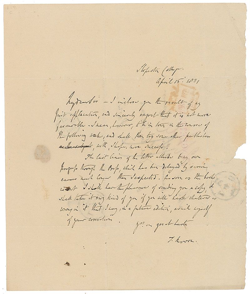 Famed Irish poet and songwriter (1779–1852) best known for such verses as ‘The Last Rose of Summer’ and ‘Believe Me if All These Endearing Young Charms.’ ALS signed “T. Moore,” one page, 7.5 x 9, April 15, 1831. Letter to Arthur C. O’Connor. In full: “I inclose you the result of my first application, and sincerely report that it is not more favourable—I mean, however, to be in town in the course of the following week, and shall then try some other publisher, with, I hope, more success. The last lines of the letter allude to my own progress through the Press, which has been delayed by various causes much longer than I expected. As soon as the book is out I shall have the pleasure of sending you a copy, & shall take it very kind of you if you will mark whatever is wrong in it that I say in a future edition, avail myself of your corrections.” The reverse bears an address panel in Moore’s hand. Intersecting folds, a few spots of toning, and a small area of paper loss to right edge from wax seal, otherwise fine condition.