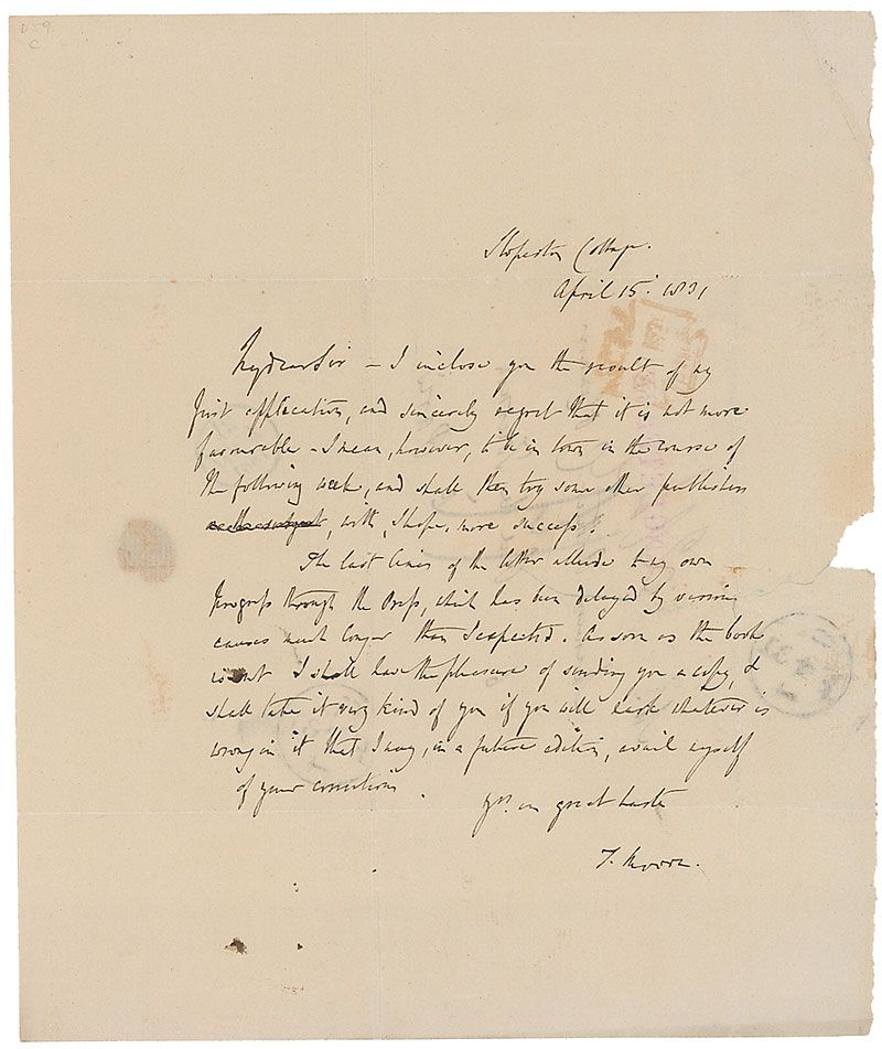 Famed Irish poet and songwriter (1779–1852) best known for such verses as ‘The Last Rose of Summer’ and ‘Believe Me if All These Endearing Young Charms.’ ALS signed “T. Moore,” one page, 7.5 x 9, April 15, 1831. Letter to Arthur C. O’Connor. In full: “I inclose you the result of my first application, and sincerely report that it is not more favourable—I mean, however, to be in town in the course of the following week, and shall then try some other publisher, with, I hope, more success. The last lines of the letter allude to my own progress through the Press, which has been delayed by various causes much longer than I expected. As soon as the book is out I shall have the pleasure of sending you a copy, & shall take it very kind of you if you will mark whatever is wrong in it that I say in a future edition, avail myself of your corrections.” The reverse bears an address panel in Moore’s hand. Intersecting folds, a few spots of toning, and a small area of paper loss to right edge from wax seal, otherwise fine condition.