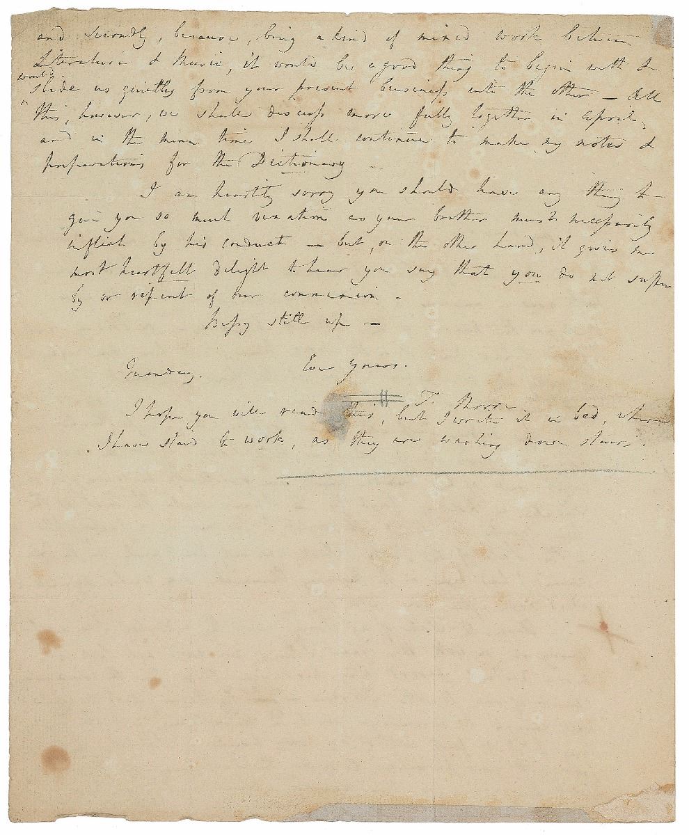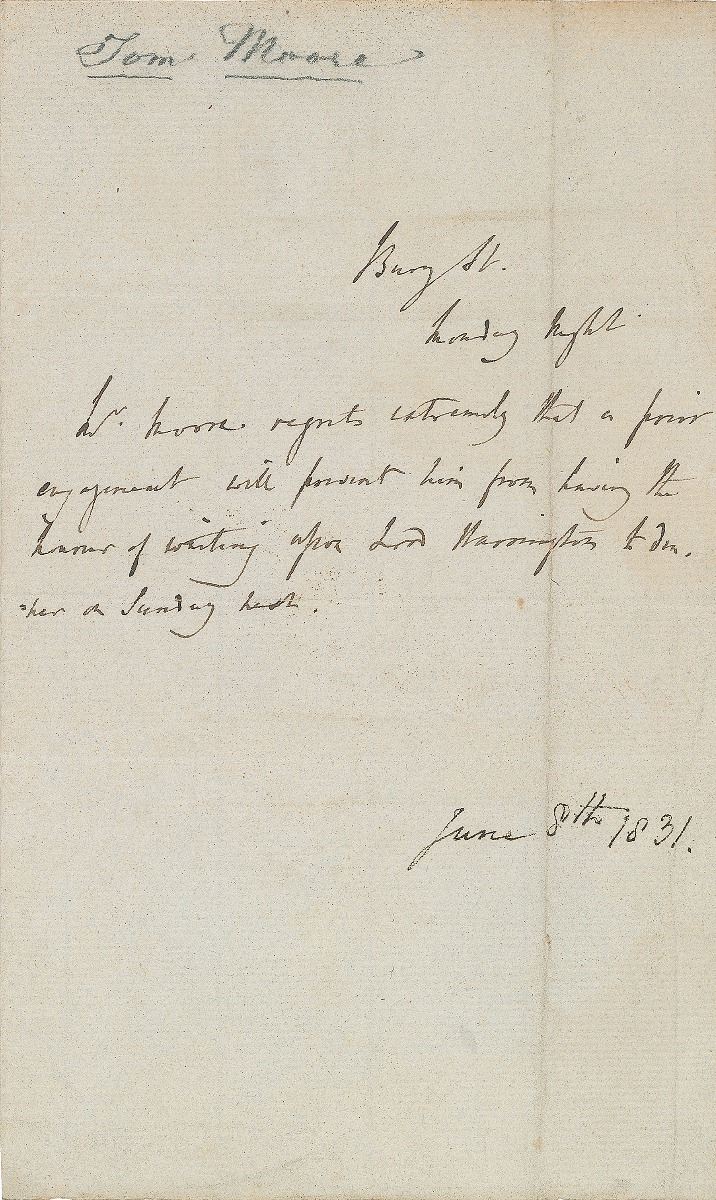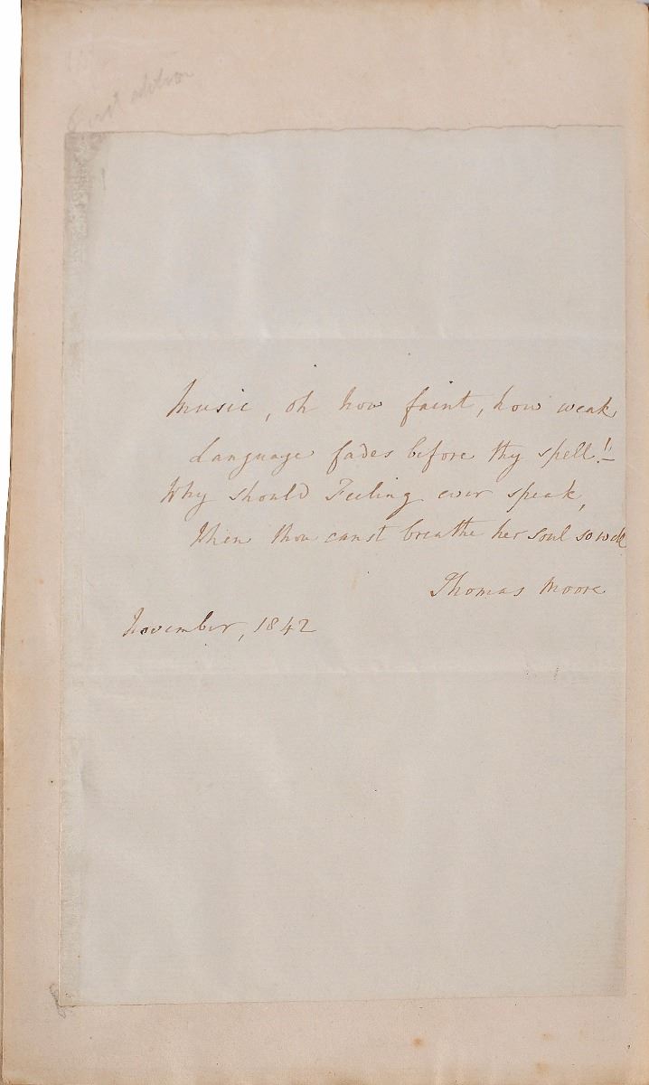 Four signed items, including a verse and three letters: an autograph stanza from his poem ‘On Music,’ signed “Thomas Moore,” affixed opposite the half-title page of an 1823 edition of The Loves of Angels; an ALS, one page both sides, 7.5 x 9.25, February 9, 1813, discussing his poetry and publishing matters; an ALS, one page, 4.5 x 7.25, December 5, 1827, discussing plans for after Christmas; and a third-person ALS, one page, 4.5 x 7.25, June 8, 1831, declining an invitation. In overall very good to fine condition, with the book neatly rebacked with original spine laid down. Accompanied by a custom-made leather slipcase.