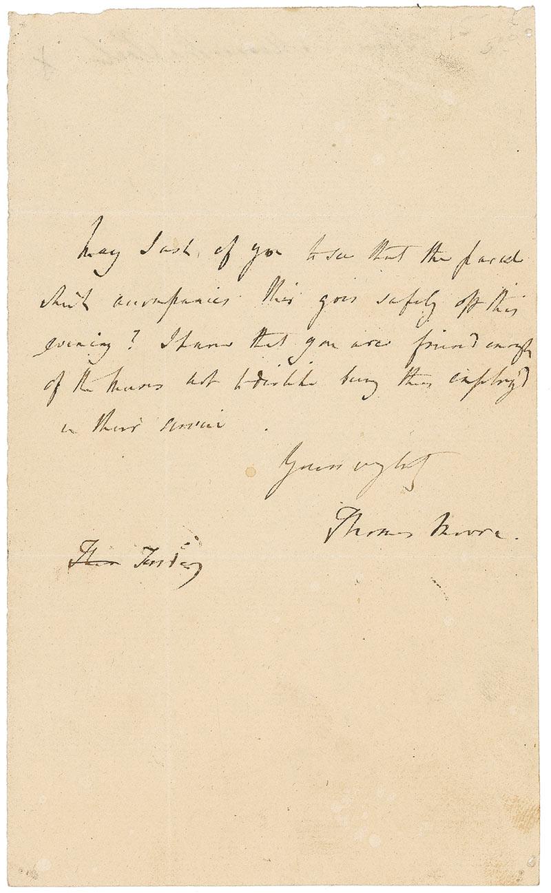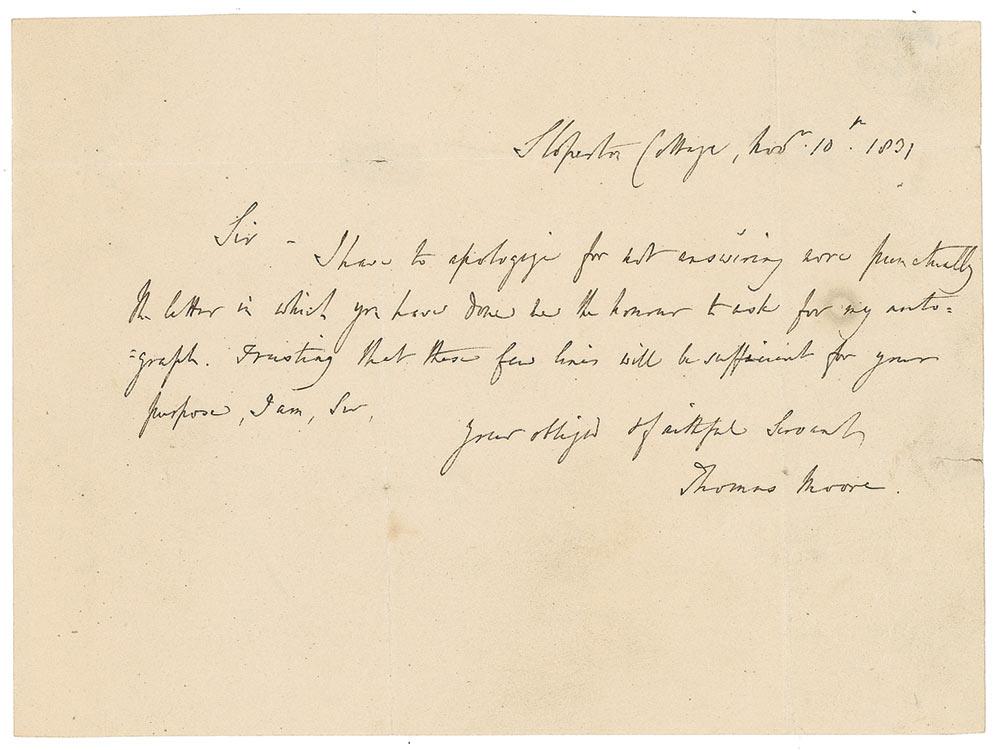 Famed Irish poet and songwriter (1779–1852) best known for such verses as “The Last Rose of Summer” and “Believe Me If All These Endearing Young Charms.” Two ALSs, one undated and one dated November 10, 1831,from Sloperton Cottage in response to an autograph request. In fine condition, with intersecting folds, light soiling, and old tape repair on the back of one letter to reinforce two intersecting folds.