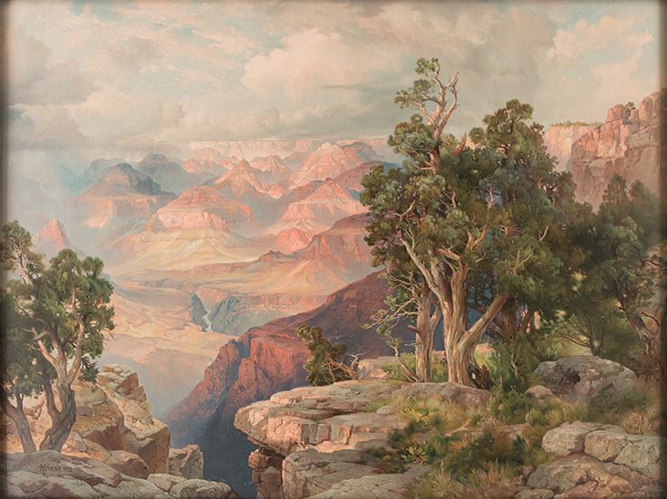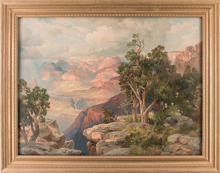 Thomas Moran (1837-1926).Grand Canyon of Arizona on the Santa Fe. 26" x 35" chromolithograph. Signed and dated 1912 lower left. Allegedly created in 1912 for the Fred Harvey Company to display in the Harvey House Hotel, along the Santa Fe rail line. Chromolithography is a method for making multi-colour prints. This type of colour printing stemmed from the process of lithography, and it includes all types of lithography that are printed in colour.