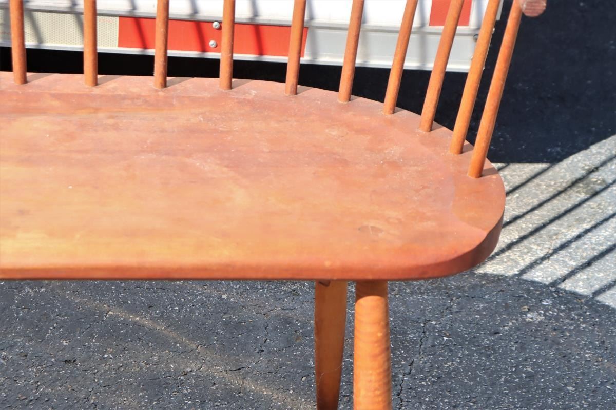 Thomas Moser "Continuous Arm Bench" Shaker Bench with spindle back. Signed and dated 1977 underneath. Damaged areas can bee seen in photos.