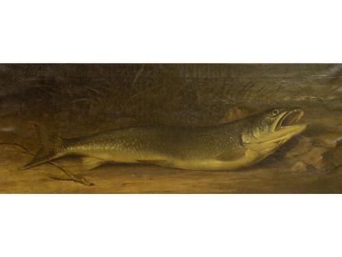 [Canadian OSA, RCA 1838-1934] UNTITLED (TROUT); 1869 Oil on canvas 12 x 30 ins. Signed & dated