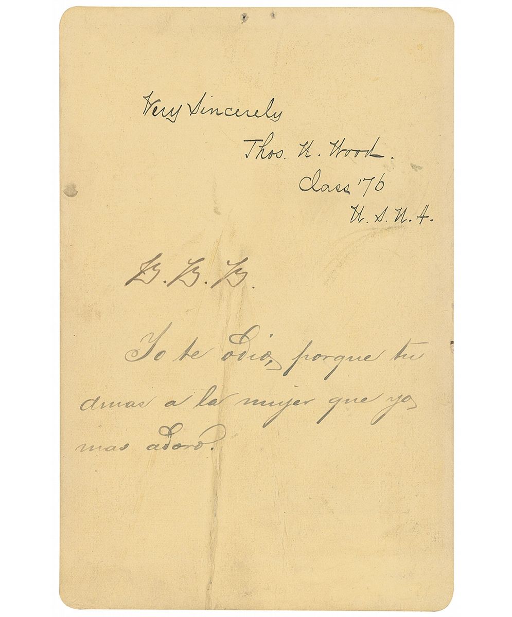 US naval officer. Original 4 x 6.5 cabinet photo by an anonymous studio, signed on the reverse in black ink, “Very sincerely, Thos. N. Wood, Class ‘76 U.S.N.A.” In very good condition, with two tack holes to top edge, a vertical crease through image, and heavier vertical creases to reverse.