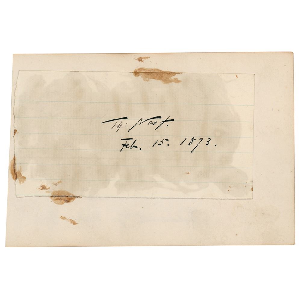 Influential early American political cartoonist and illustrator (1840–1902) considered to be the 'Father of the American Cartoon.' Ink signature, "Th: Nast, Feb. 15, 1873,†on an off-white 5 x 2.5 slip affixed to a slightly larger page. In very good to fine condition, with show-through from adhesive on the reverse and some toned adhesive to edges.