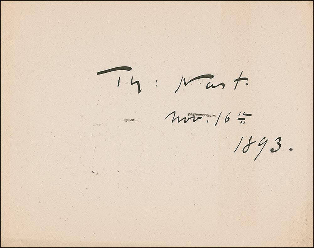 American political cartoonist and illustrator (1840–1902) best known for devising the donkey and elephant symbols of the Democratic and Republican parties and the familiar ‘American’ version of Santa Claus. Fountain pen signature, “Th: Nast, Nov. 16th, 1893,” on an off-white 4.5 x 3.75 card. In fine condition, with a few stray ink marks and some light edge creasing and toning.