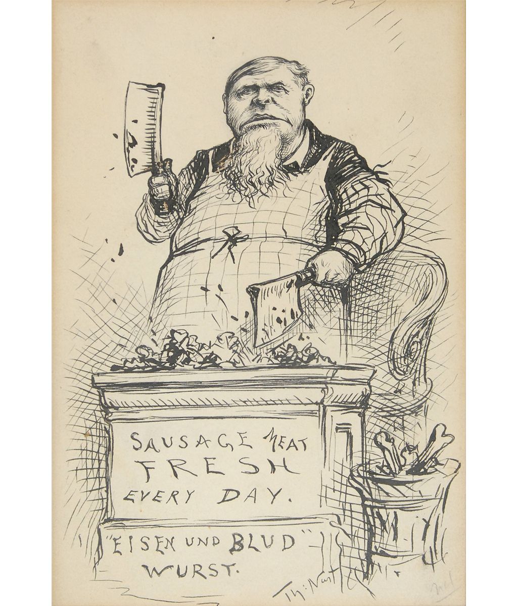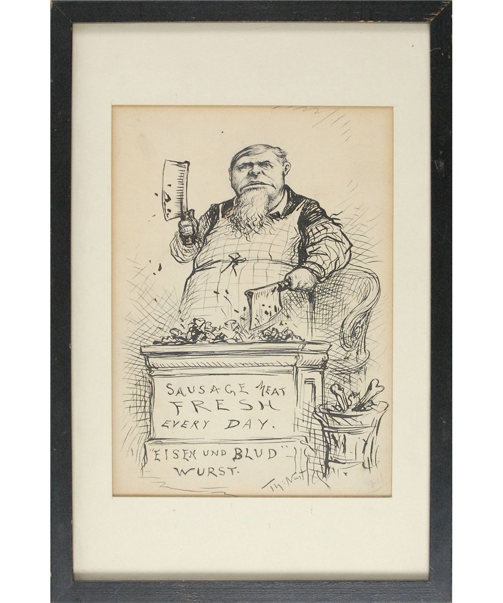 Influential early American political cartoonist and illustrator (1840–1902). Exceptional example of one of Nast’s famous political caricatures, drawn in bold black ink on an off-white 6 x 8.5 sheet, signed at the bottom, “Th: Nast.” The illustration unflatteringly depicts Senator Preston B. Plumb of Kansas seated behind his desk and dressed as a butcher, wielding impressive cleavers as he violently chops up sausage. The front of the desk reads: “Sausage Meat Fresh Every Day. ‘Eisen und Blud Wurst.’” Matted and framed to an overall size of 8.75 x 13. In fine condition. Accompanied by a photocopy of a news clipping from the period describing the cartoon. An uncommon complete, published cartoon from arguably the most influential satirist of his day.