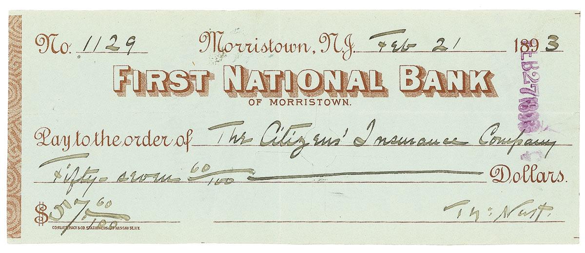 American political cartoonist and illustrator (1840–1902) best known for devising the donkey and elephant symbols of the Democratic and Republican parties. Bank check, 7.25 x 3, filled out and signed by Nast, “Th: Nast,” payable to The Citizens Insurance Company for $57.60, February 21, 1893. In fine condition, with cancellation cut to center, a vertical fold, and a couple bank stamps, none of the flaws affecting the clean signature area. RRAuction COA.