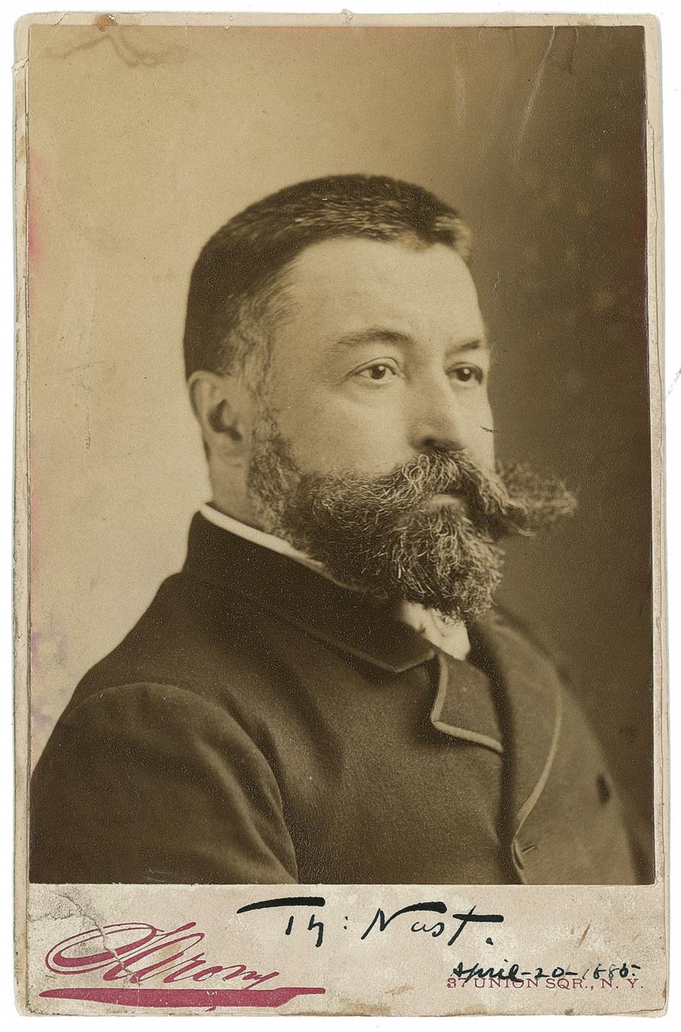 American political cartoonist and illustrator (1840–1902) best known for devising the donkey and elephant symbols of the Democratic and Republican parties and the familiar “American” version of Santa Claus. Uncommon 4 x 6.5 Sarony cabinet portrait of the impressively-whiskered artist in three-quarter profile, boldly signed in ink in the lower border, “Th: Nast, April 20, 1885.” Moderate image wrinkling primarily to edges, light silvering, a crack to lower left corner, soiling to borders, and some scattered stains, otherwise very good condition. While his creations are recognizable, images of the less recognizable illustrator are surprisingly elusive. Provenance: The Barry Hoffman Collection.